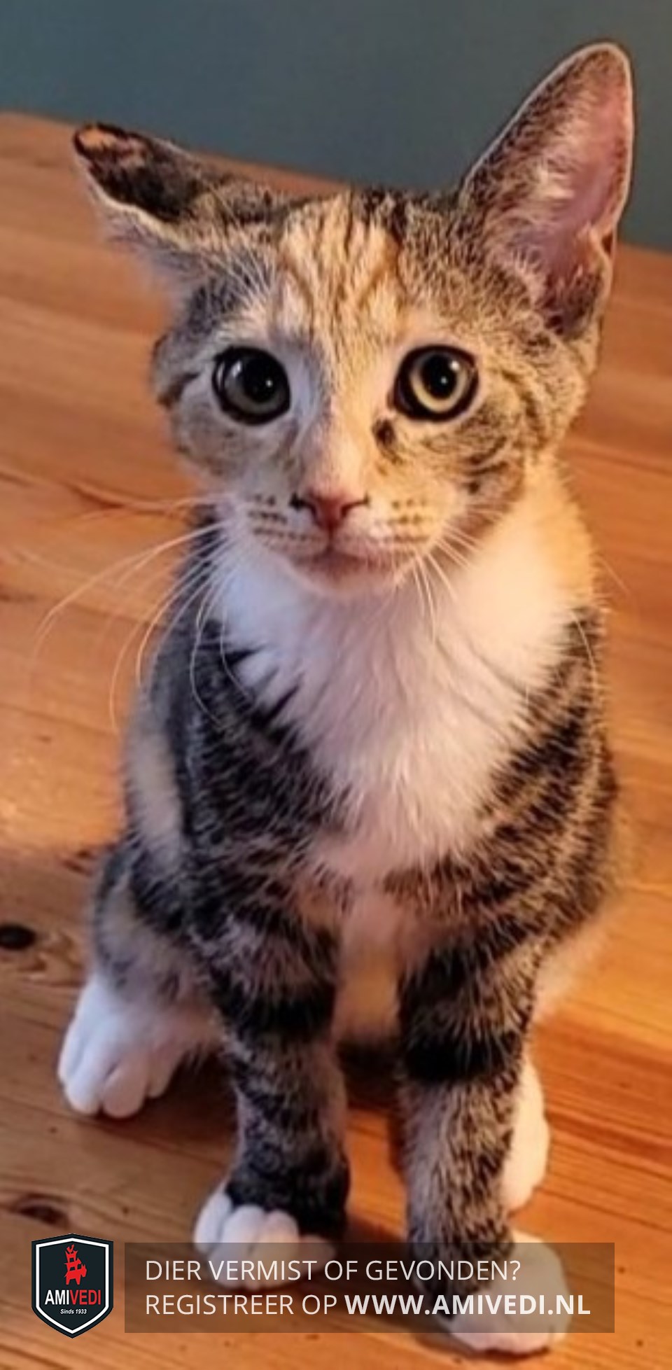 | Signalement | Cypers grijs-zwart met rood en wit. Zwart vlekje onder de linker binnen-ooghoek. Wit op de bovenlip. Wit op de kin. Wit op de bef. Wit op de borst. Witte voetjes op de voorpootjes. |