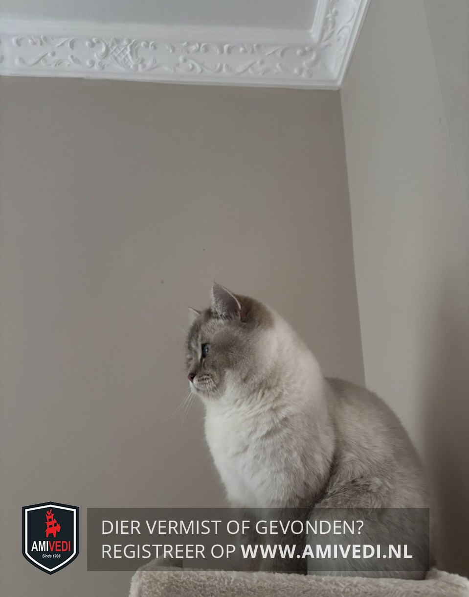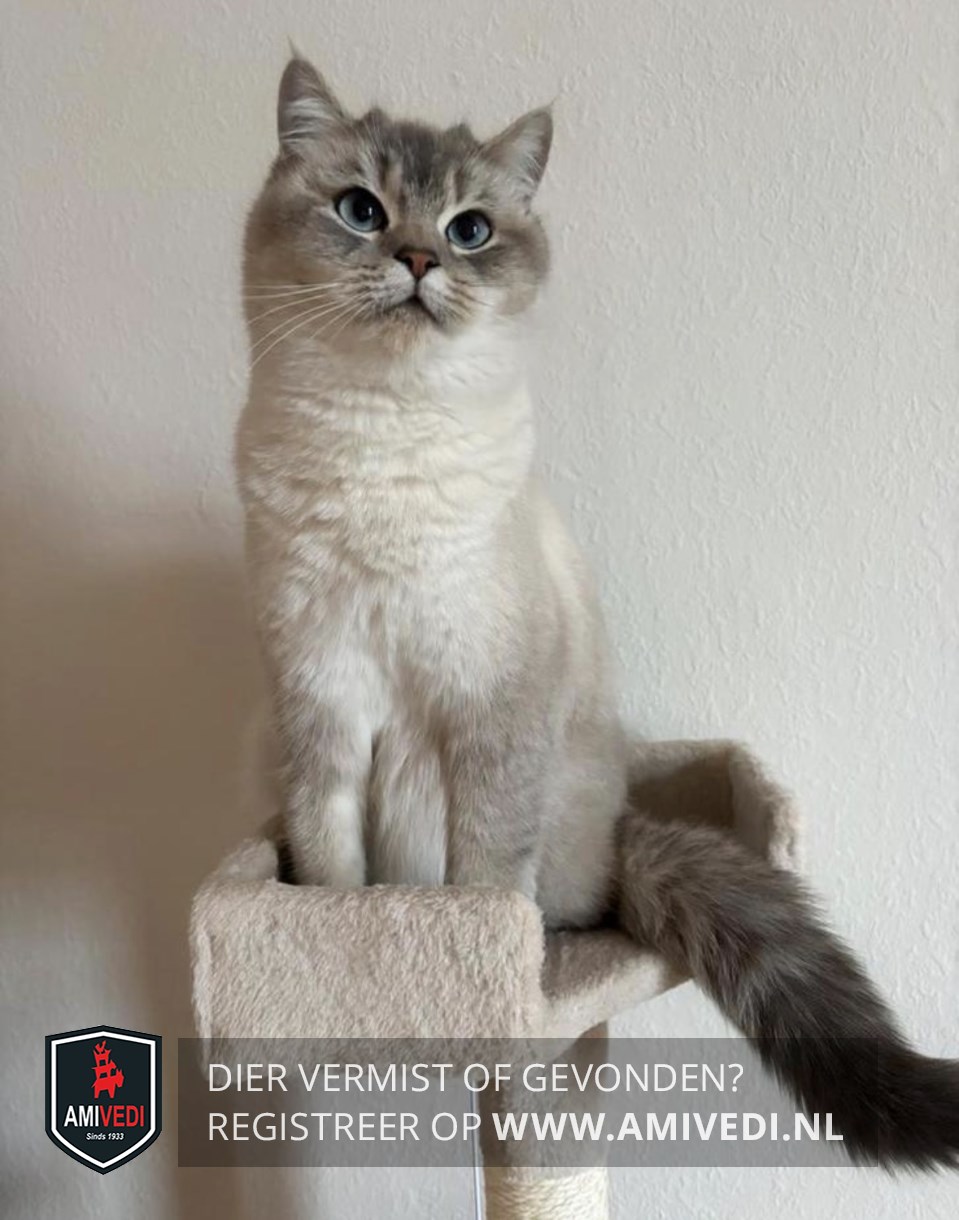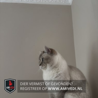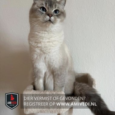 | Signalement | Grote blauwe ogen, miauwt veel nu, want ze is krols. Grijs kopje. Wit onder de neus. Pootjes en rug zijn licht grijs. Kin, bef, borst en buik zijn wit. De staart gaat van licht naar donker grijs bij de punt. |