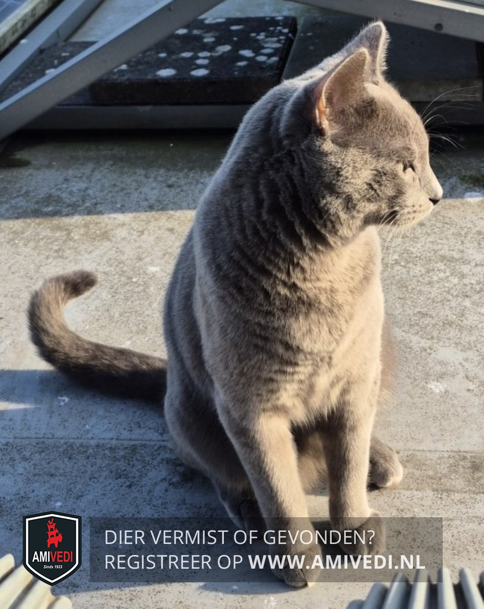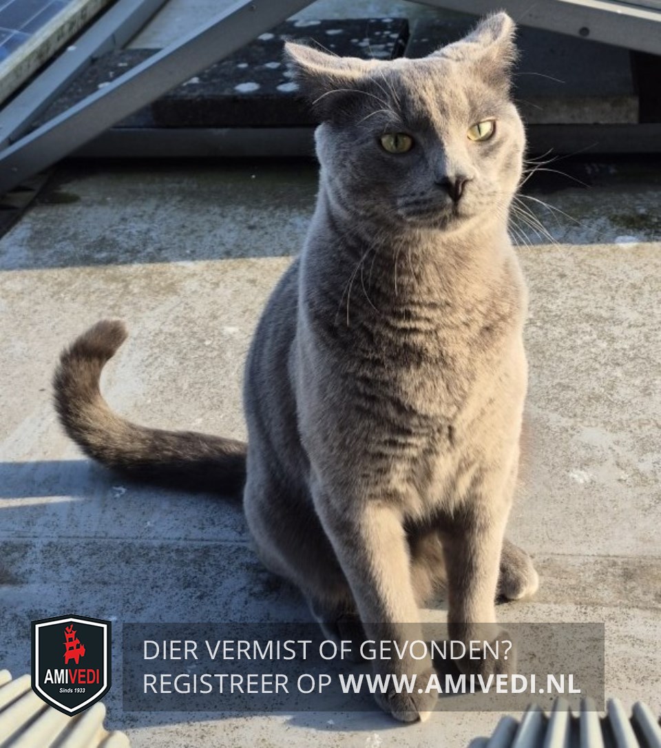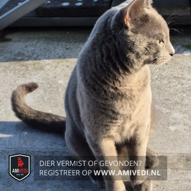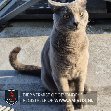 | Signalement | Geheel grijze kat, middel groot, schuw. |