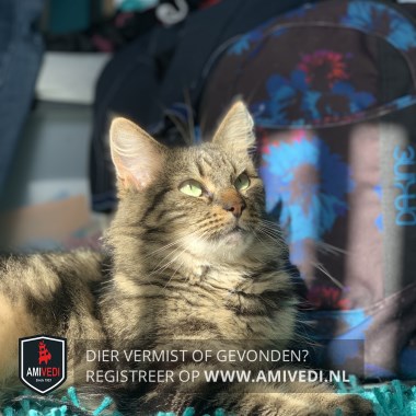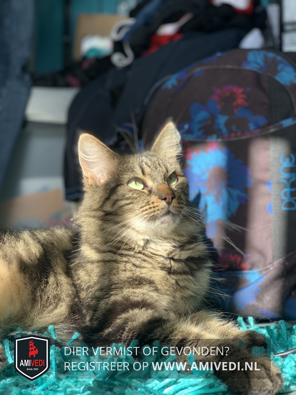 | Signalement | Geheel cypers gestreept. Groene ogen. Plukjes aan haar poten. Zwarte vlekjes op lichte kin. Maine coon kruising. Heeft de kenmerken van een Maine Coon. Maar is een stuk kleiner. +- 3,5 kg. Binnen kat. |