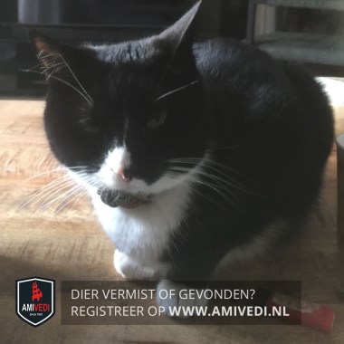 | Signalement | Rechterkant neus is wit rechts is zwart. Wit streepje op de bles. Witte kin, bef, borst en buik. |