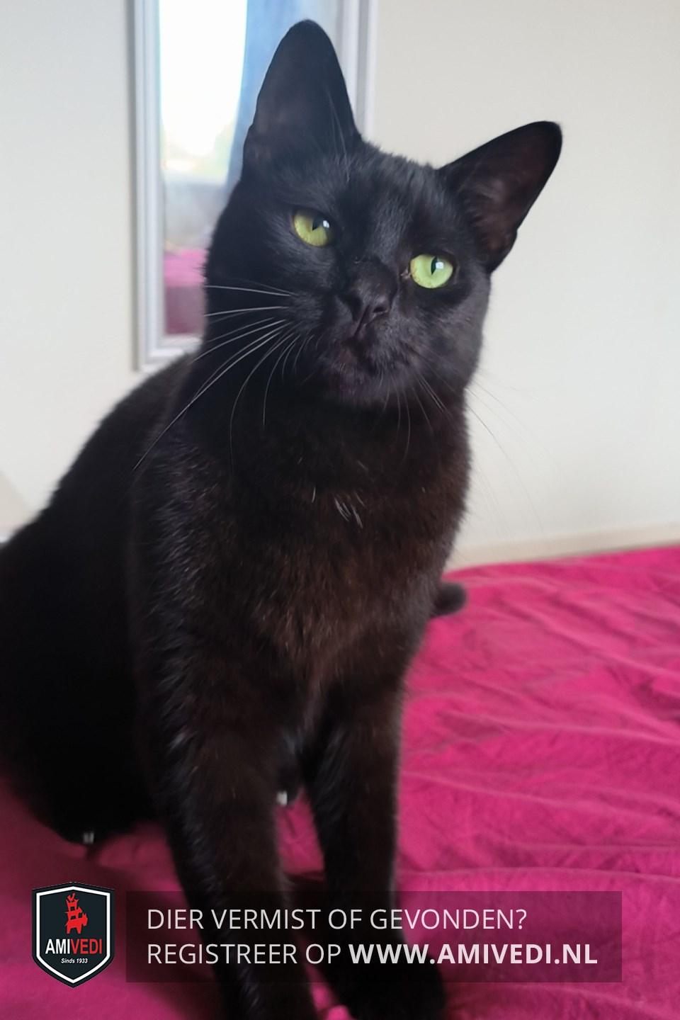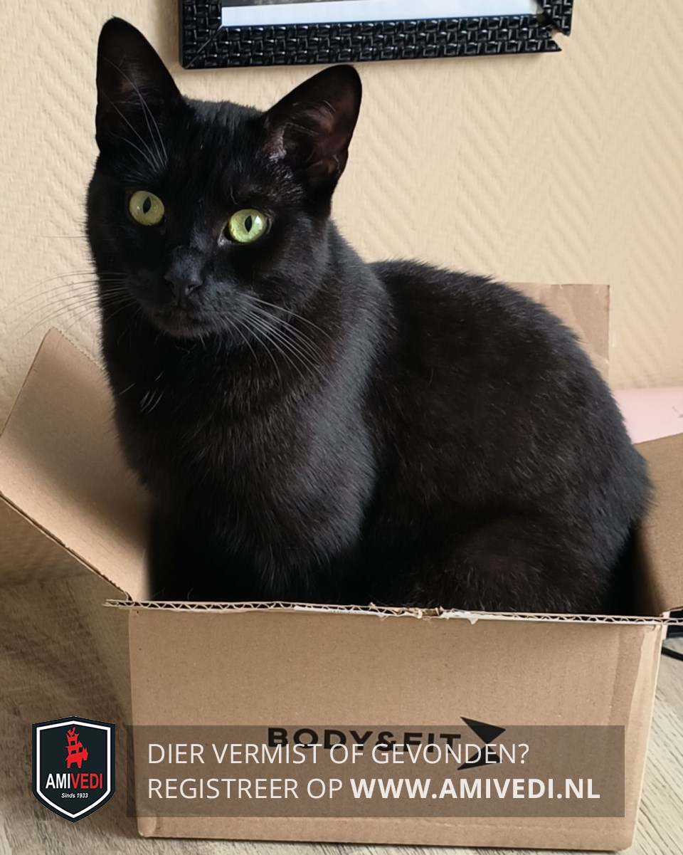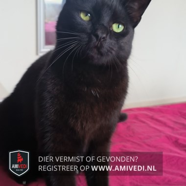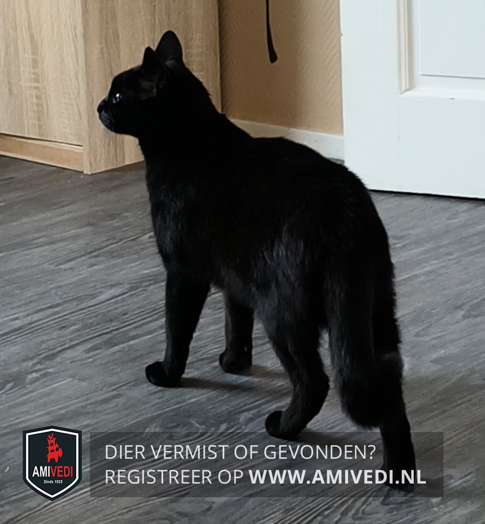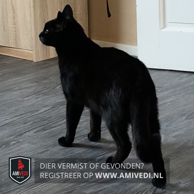 | Signalement | Klein/middel zwart Katje. Groene ogen. Paar witte haartjes op de borst. |