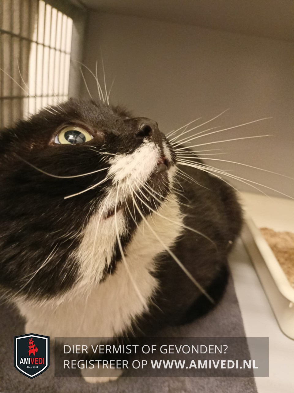 | Signalement | Overwegend zwart met witte vlakken naast de (zwarte) neus. De onderlip is zwart, het zwart loopt nog een stukje door op de kin die verder wit is. Brede witte bef, witte teentjes aan de voorpoten |