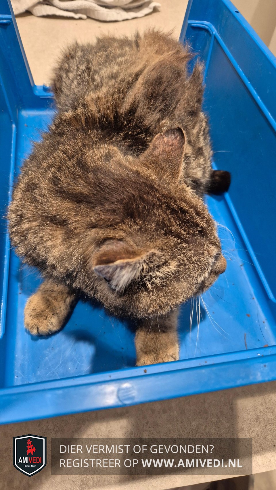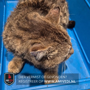 | Signalement | Cypers gestreepte (bijna gemêleerde) kater, zwart bovenop het kopje, wat wit bij de kin |