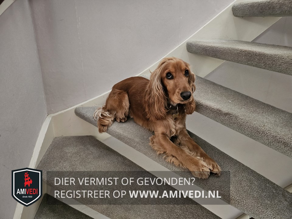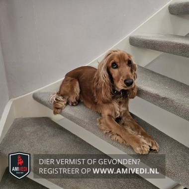 | Signalement | Cookie; Engelse cockerspaniël van 17 maanden oud. Kleur goudbruin met witte buik. heeft een goudkleurige penning om in de vorm van een botje |