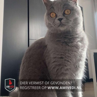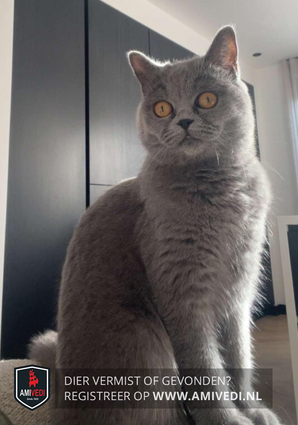 | Signalement | Britse korthaar poes, volledig grijs met gele ogen en traanafdrukken bij de oogjes. |