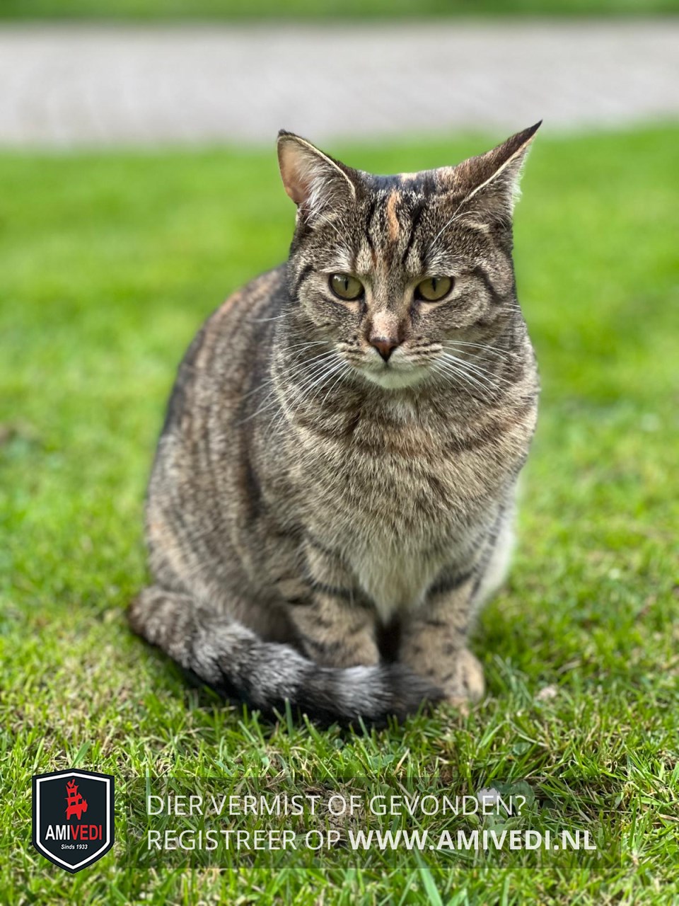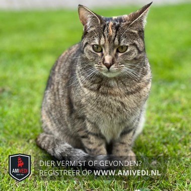 | Signalement | Cypers roodbruin/grijs/zwart poesje, rood streepje op het kopje, lichtbruin neusje, wat wit rond het bekje en wat wit op de buik. Cypers grijs/bruin licht gestreepte staart. |