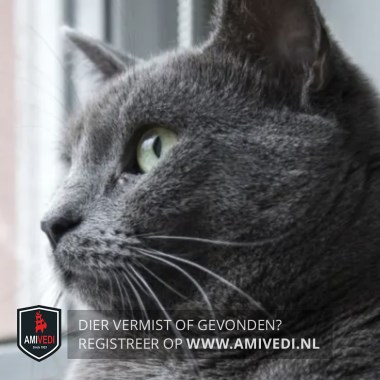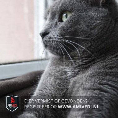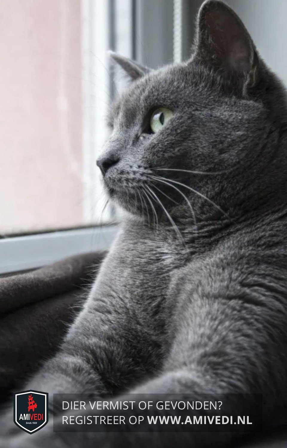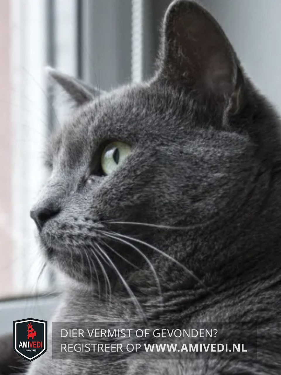 | Signalement | Geheel grijze (blauwe) poes. Groene ogen. |