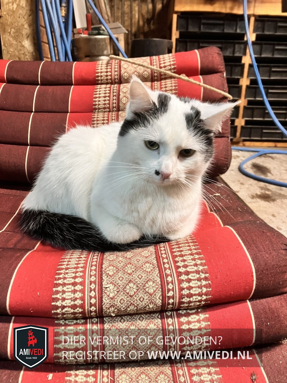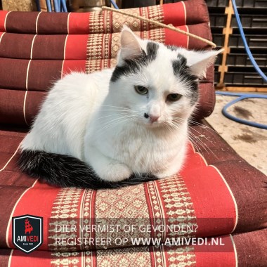 | Signalement | Witte kat met zwart rond haar oren, zwarte stip naast haar neus, zwarte staart. |
