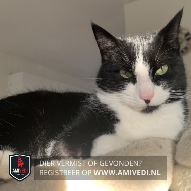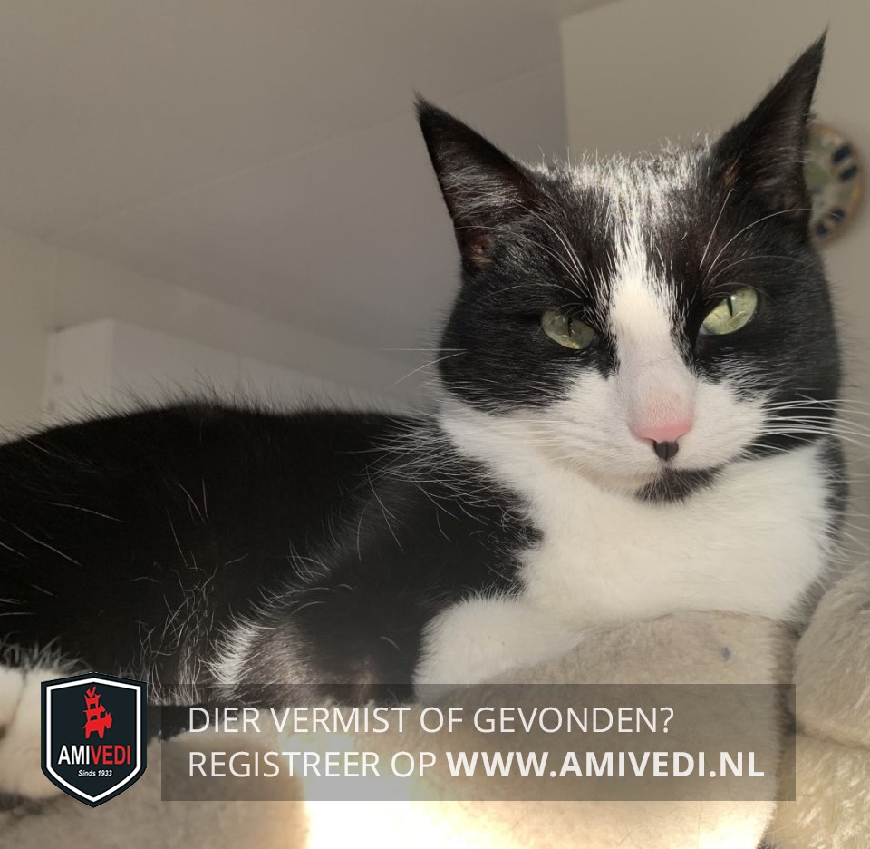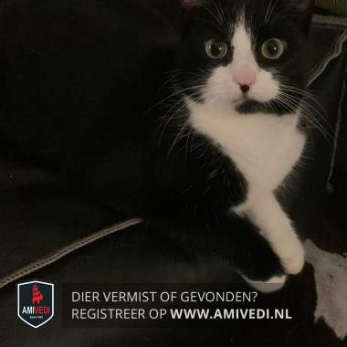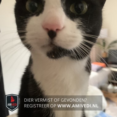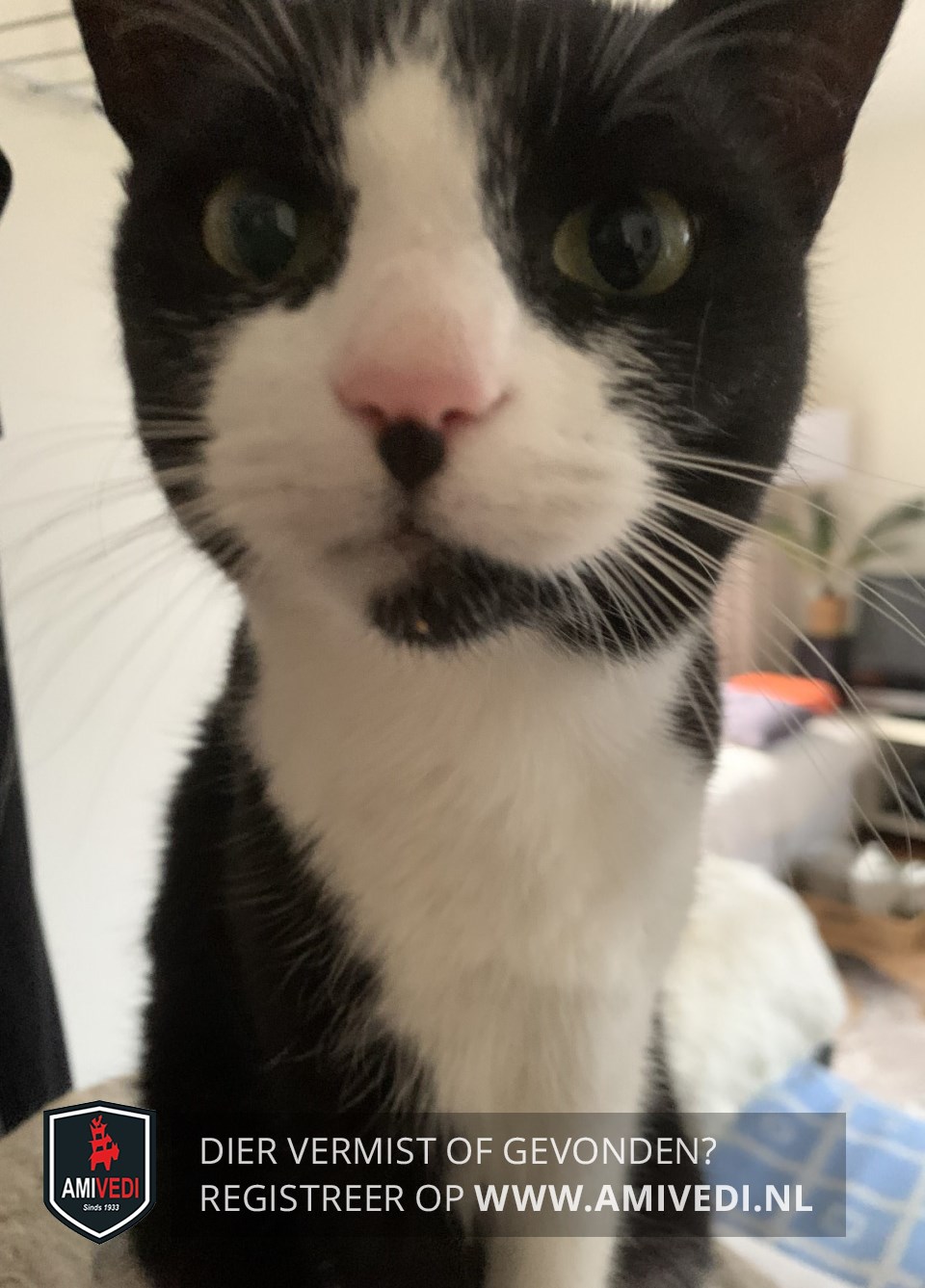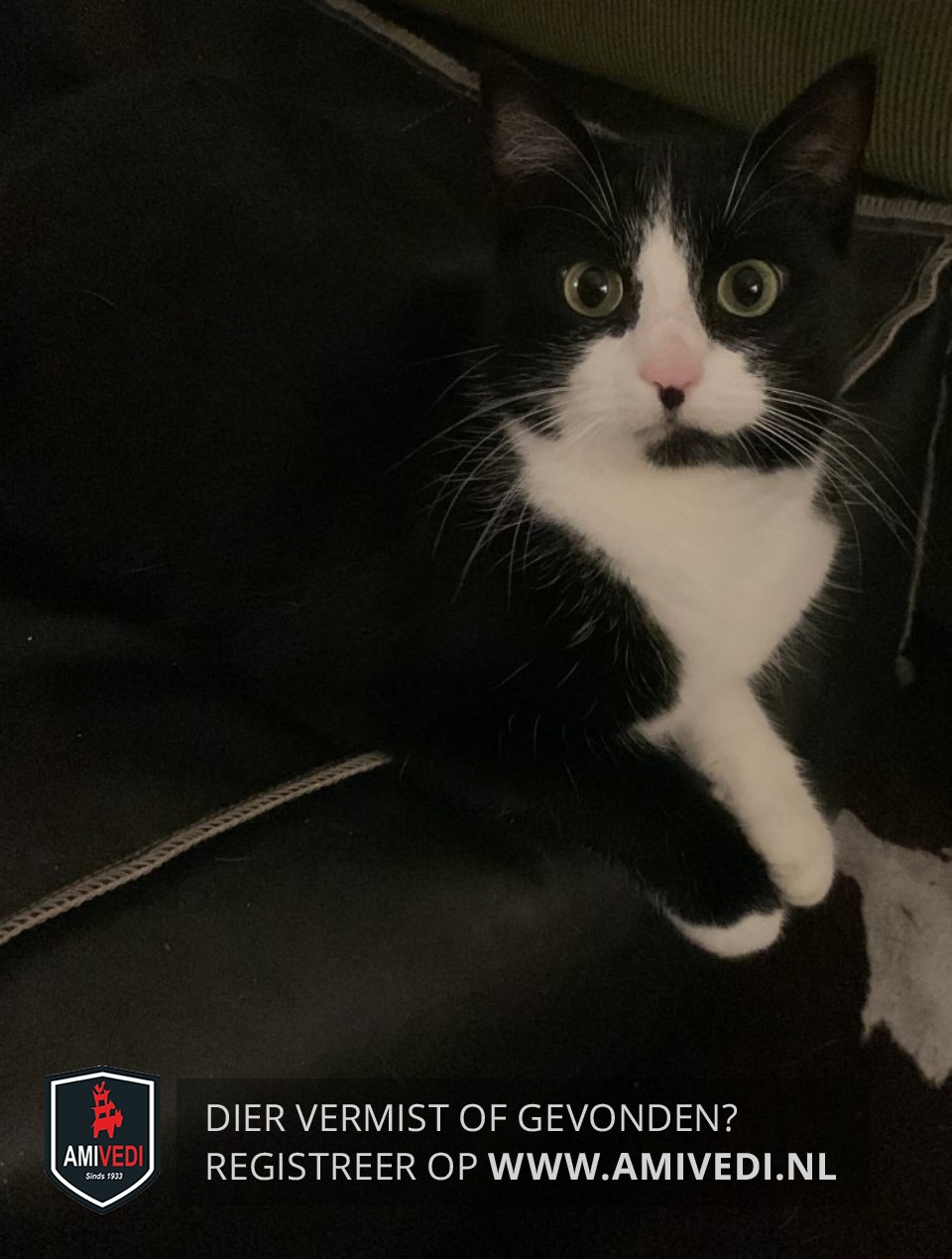 | Signalement | Zwart/wit. Zwarte oren en zwart rond haar ogen. Klein zwart vlekje onder haar neus. Zwart onder haar kin wat links doorloopt naar haar kopje. Zwart rechter voorpoot met witte tenen. Zwarte rug. |