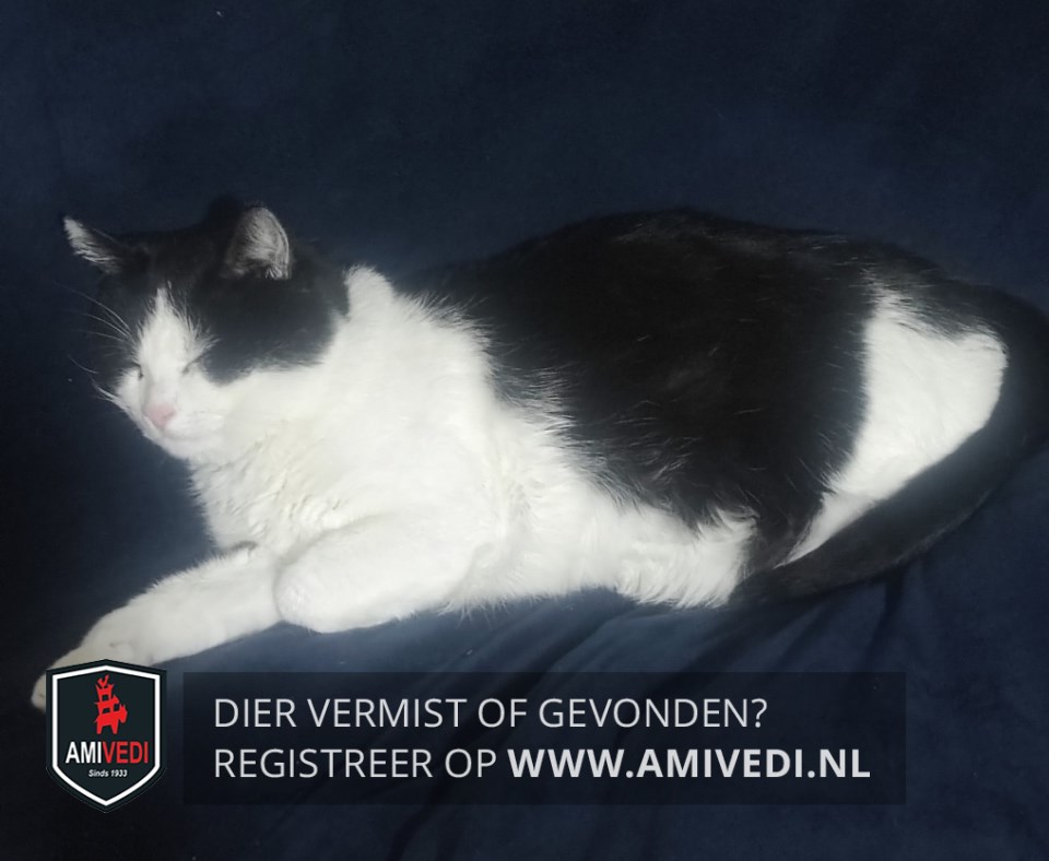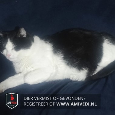 | Signalement | Europese korthaat, wit met zwart. Bovenkant kopje, oren en wangen zwart. Over de rug vanaf de schouders een zwart dek over de rug uitlopend naar linker flank. Witte bles, witte snuit, witte bef, witte borst, witte buik. Voor- en achterpoten wit en linkerheup wit. Zwarte staart. |