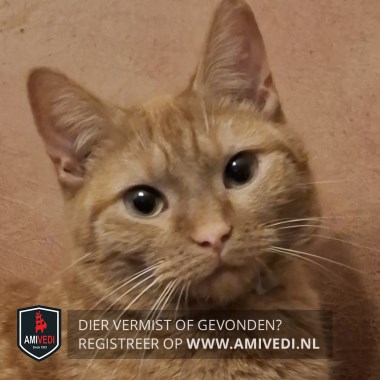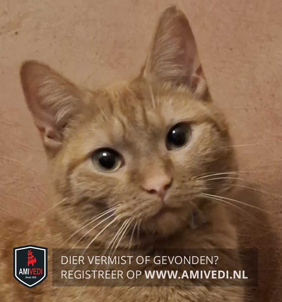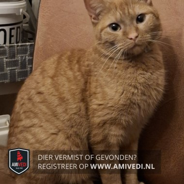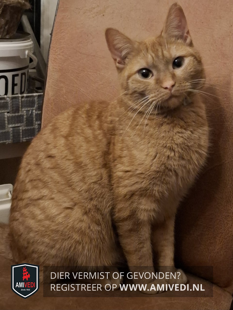 | Signalement | Geheel cypers rood gestreepte kater. Linkeroor heeft een klein sneetje bovenin. Groene ogen. Neusje heeft een littekentje dus niet helemaal vol roze. |