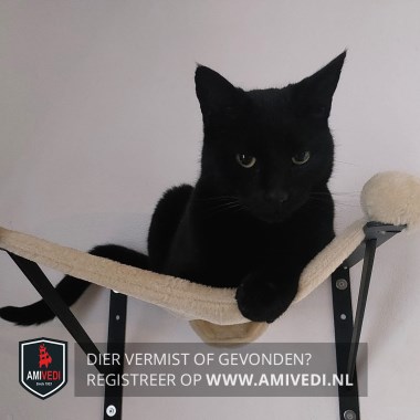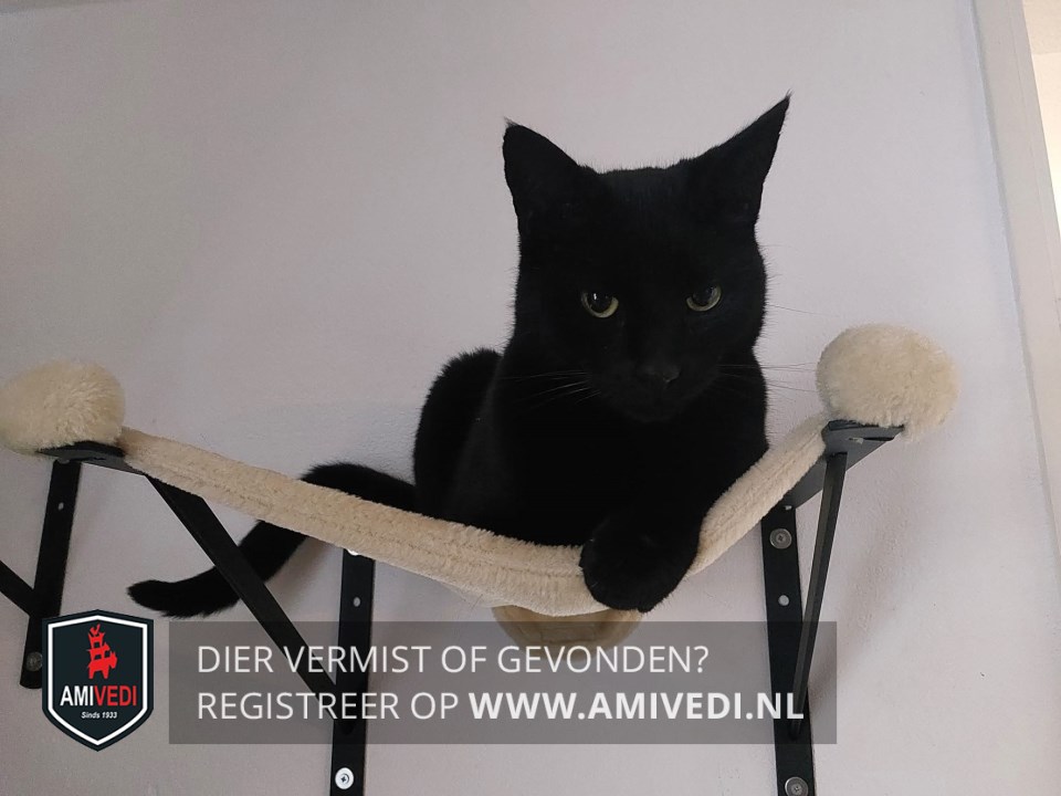 | Signalement | Volledig zwarte kat mit een paar witte plukjes onder de kin. |