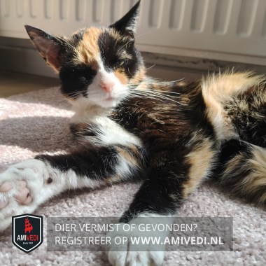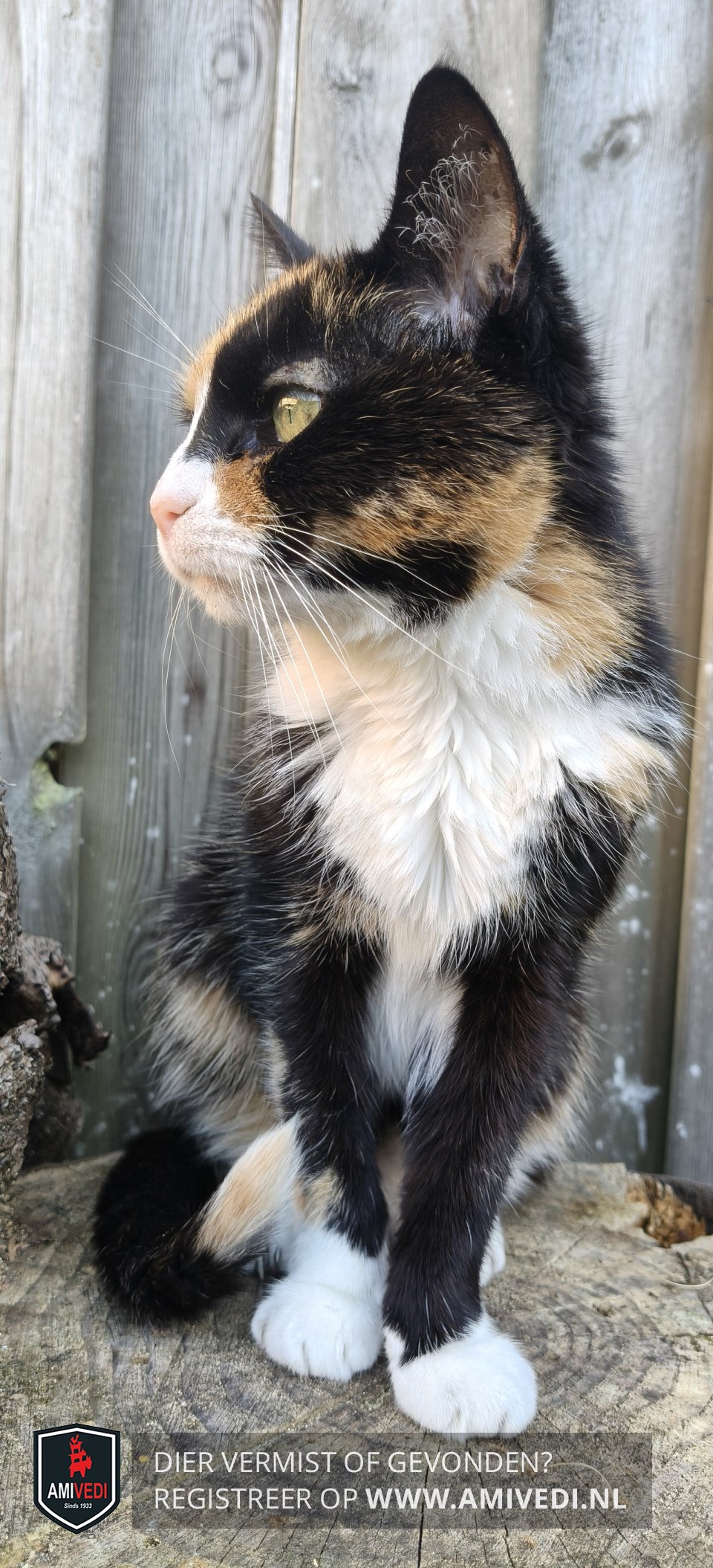| Signalement | Zwart op de oren. Zwart met rood op de kop. Rechts op de bles rood, links op de bles zwart. Zwart rond de ogen met onder het linkeroog een rode vlek. Een dunne witte streep over de neusbrug, wit op de snoet, kin, kaaklijn, bef, borst, en buik. Op de rug en de flanken zwart/rood gemêleerd. Een wit mini sokje aan de rechter voorpoot, een wit voetje aan de linker voorpoot waarvan het wit aan de buitenkant iets omhoog loopt. De staart is voornamelijk zwart met een wit/rood gemêleerd uiteinde. |