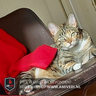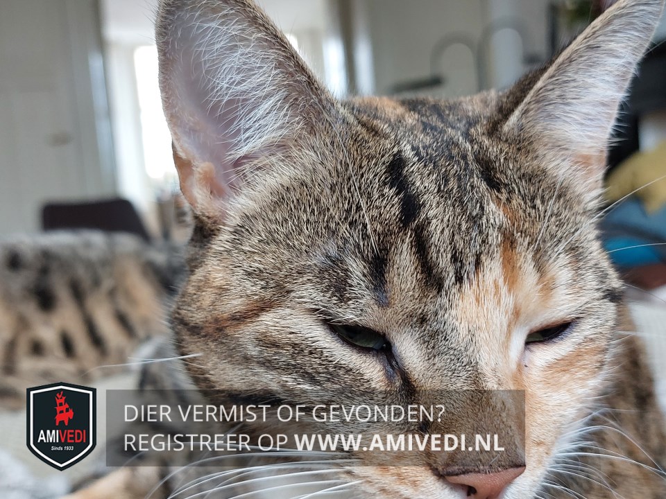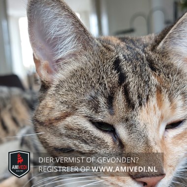 | Signalement | Cypers gestreepte zwart bruin poes met een bruine neus en wat wit aan de bek en kin, witte bef en witte teentjes aan de voorpootjes en witte voetjes aan de achterpootjes. Voor de rest geheel cypers gestreept. |