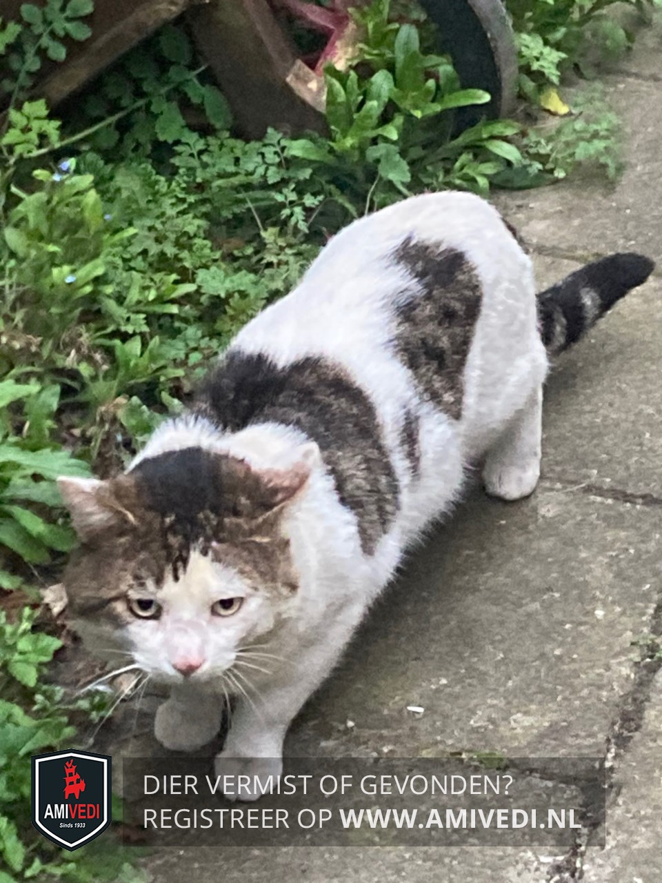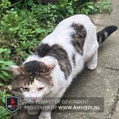 | Signalement | Wit met cypers grijs-zwart op kopje en boven de ogen, grijs-zwarte plekken op lijf, Grijs-zwart geringde staart. Zichtmelding. |