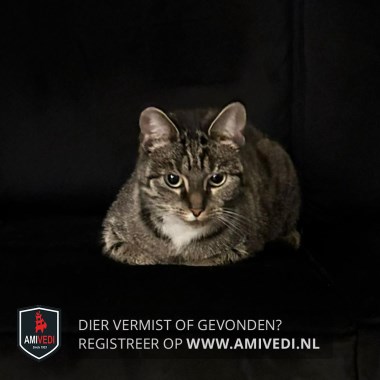 | Signalement | Cypers bruin zwart gestreepte poes met wat wit aan de bek en met een witte bef. 4 witte sokjes aan de pootjes en met een geheel cypers gestreept lijfje. |