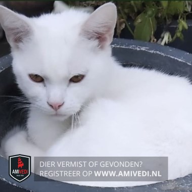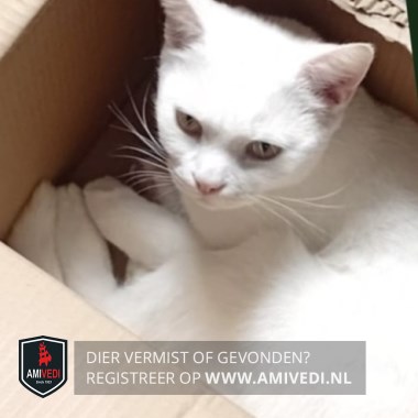 | Signalement | Volledig wit, spitse snuit, dunnere vacht op het achterlijf, ze is doof. |