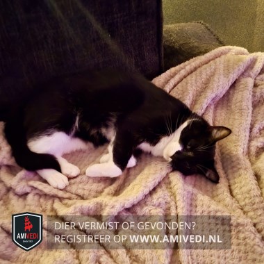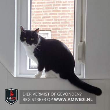 | Signalement | Zwart op de kop tot schuin over de snoet, wit onder het oog rechts, witte kin, borst en buik, witte sokjes vóór, witte pootjes achter. Wondje op de kin. |