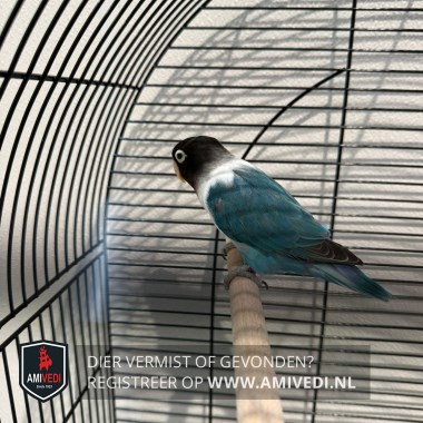| Signalement | Blauw(groen)/zwart/wit Agapornis. Zwarte kop met witte ring om de ogen Blauwe-groene vleugels met zwart uiteinde. Blauw-groene borst en staart |