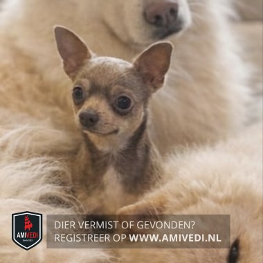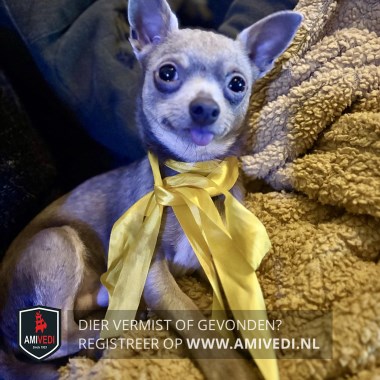 | Signalement | Grijze chihuahua kruising met overbite, lichtere snuit, keel en witte streep op de borst. |