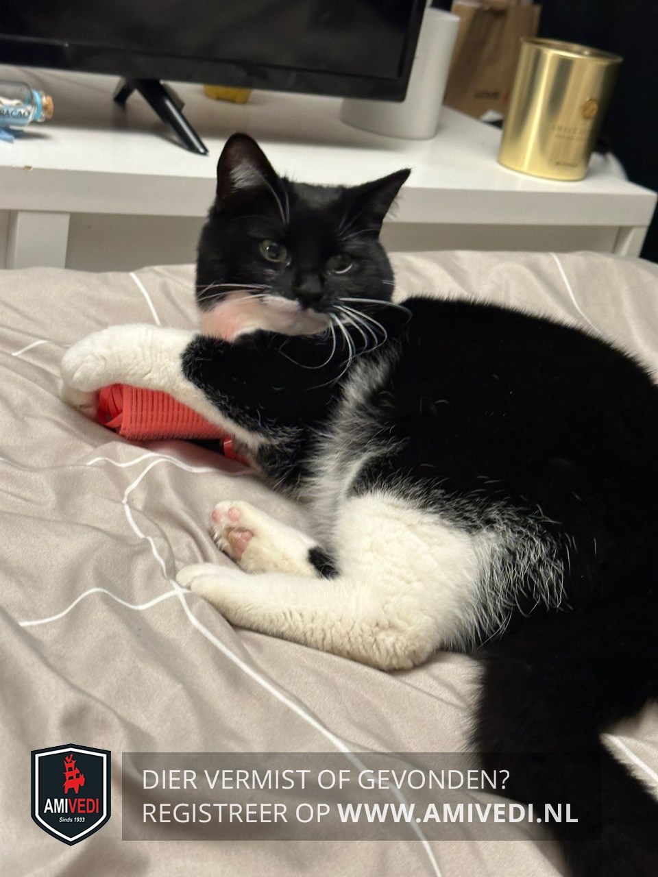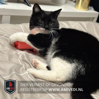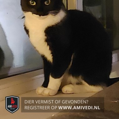 | Signalement | Zwart wit, witte snor en kin, Witte grote bef, rechter voorpoot heeft een wit voetje, linker voorpoot een wit sokje, witte achterpoten, 1 voorpootje loopt ze soms mank mee. |