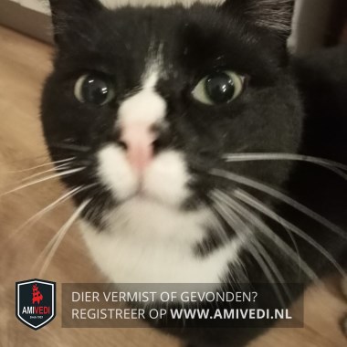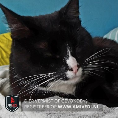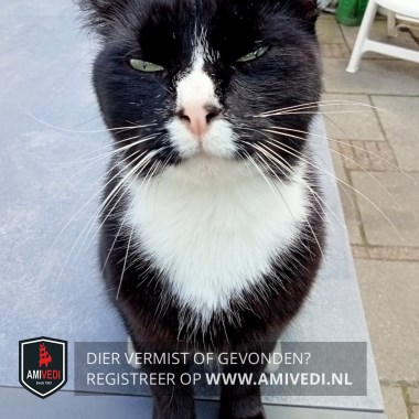 | Signalement | Zwart-witte kater. Hoofdkleur zwart. Witte neus met een smal streepje erboven. Witte lippen, kin, bef en snorharen. Voor witte tenen, achter witte voetjes. Groene ogen. |