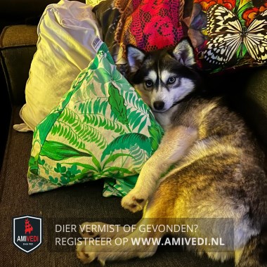 | Signalement | Het is een kruising tussen een pomeriaan en een husky. Zwart petje, witte wenkbrouwen, wangen, Grijs, beige vlekken rug, poten. Ze is loops en draagt een broekje. |