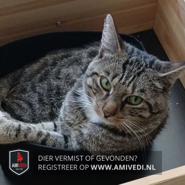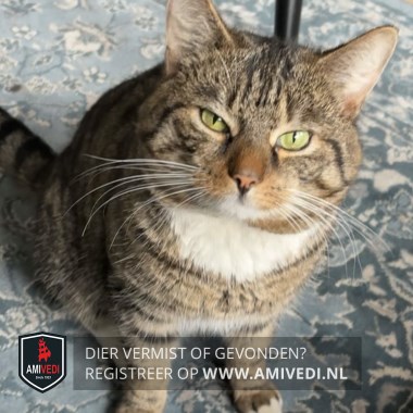 | Signalement | Cypers grijs met zwart gestreept en wit. Witte bef en witte tenen voorpootjes, achterpootjes witte sokken. Hapje boven uit rechteroor. |