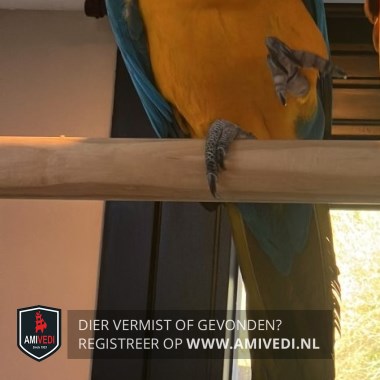 | Signalement | Ara. Zwarte kruin en snavel. Geel lijf. Blauwe vleugels. |