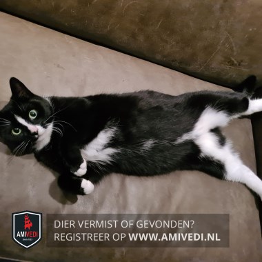 | Signalement | Zwarte kop met een klein hapje uit het puntje van het rechter oor, witte bles doorlopend over de neus, via de linker bovenlip naar de bef en (gedeelte) kraag, klein wit vlekje op de rechter bovenlip, zwarte vacht met wit tussen de voorpoten, wit vlekje midden op de buik en witte onderbuik wat doorloopt naar de achterpoten, wit laarsje rechtsachter, witte kniekous linksachter, witte teentjes voor |