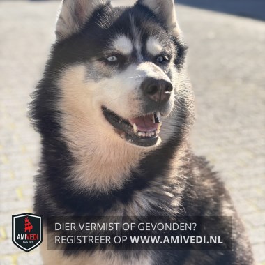 | Signalement | Husky, zwart met witte wenkbrauwen, snuit en bef, witte borst en poten, blauwe ogen. |