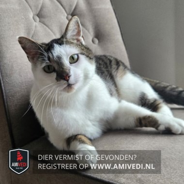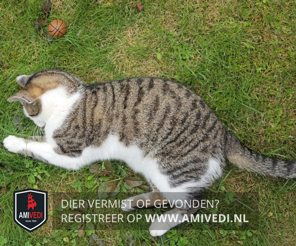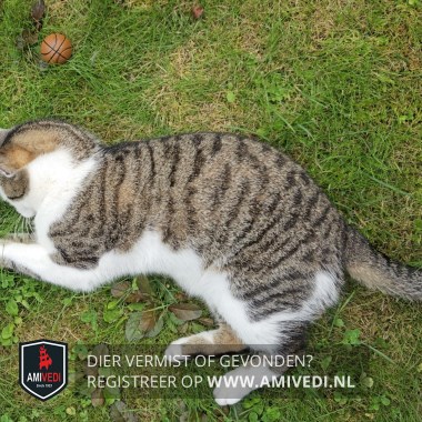 | Signalement | Cypers bruin-zwart met wit. Wit om en boven het linker oog en onder het rechter oog, witte neus, bef, borst en buik. Witte pootjes met op alle pootjes cyperse vlekken. |