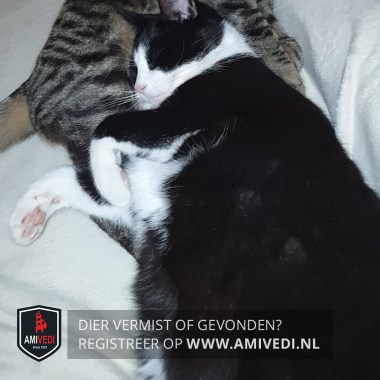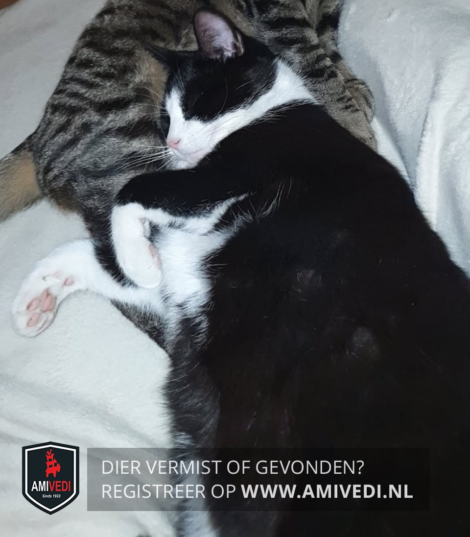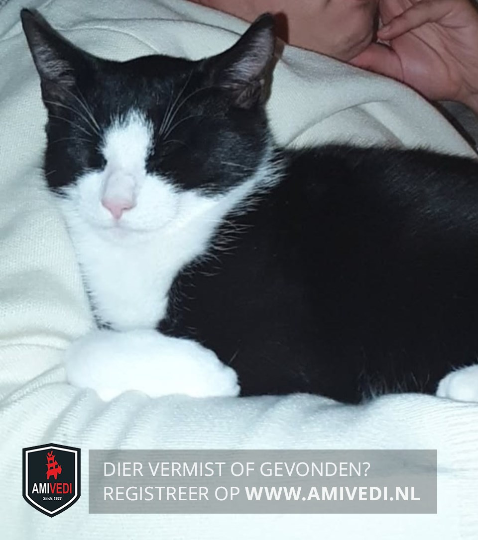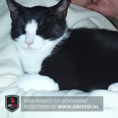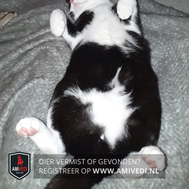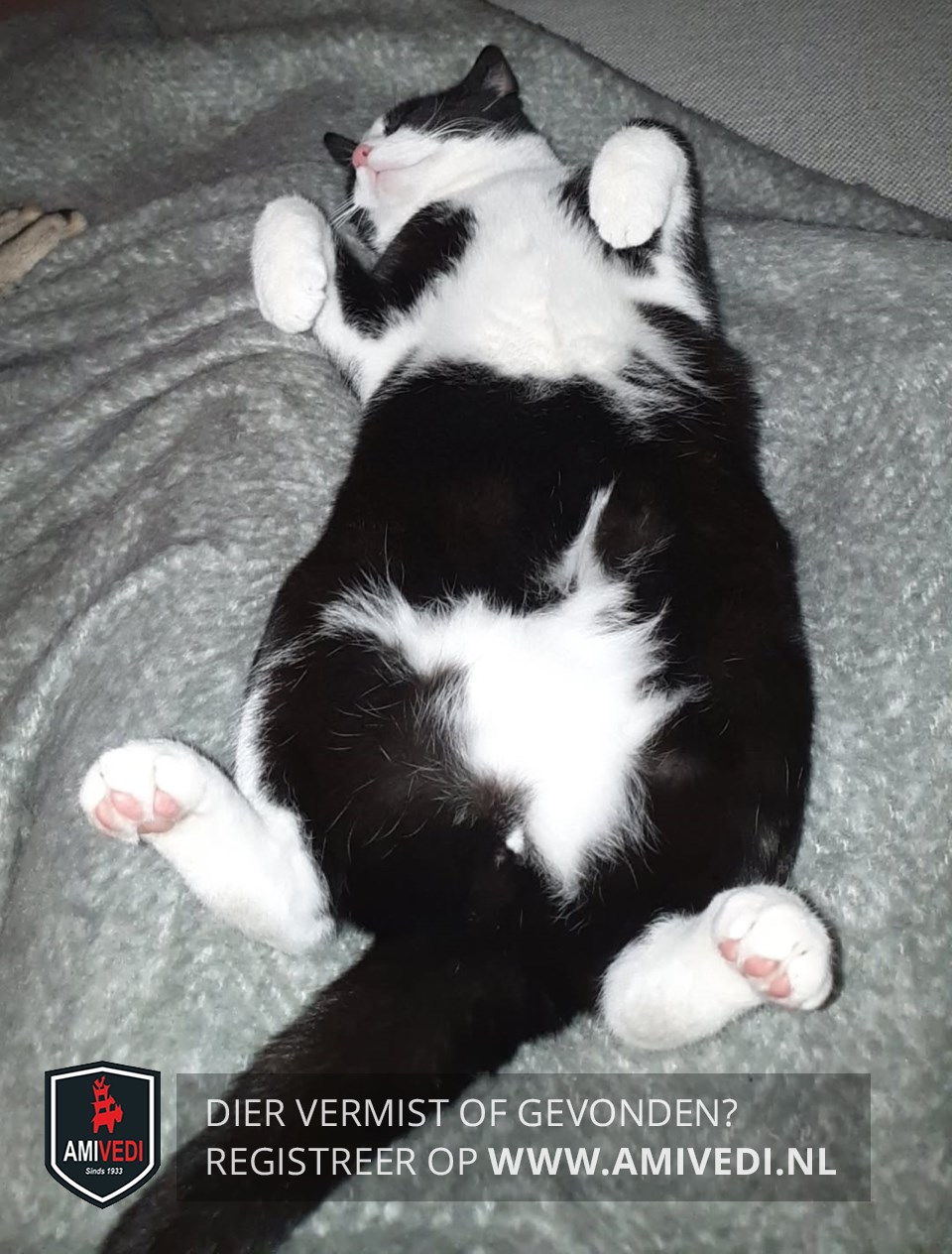 | Signalement | Zwart-witte grote kater. Witte snuit en bef. 4 witte poten, halverwege de voorpoten zwart aan de voorkant en in de oksels. Witte borstkas en grote witte vlek op de buik tussen de achterpoten. Zwarte in de liezen en staart. |