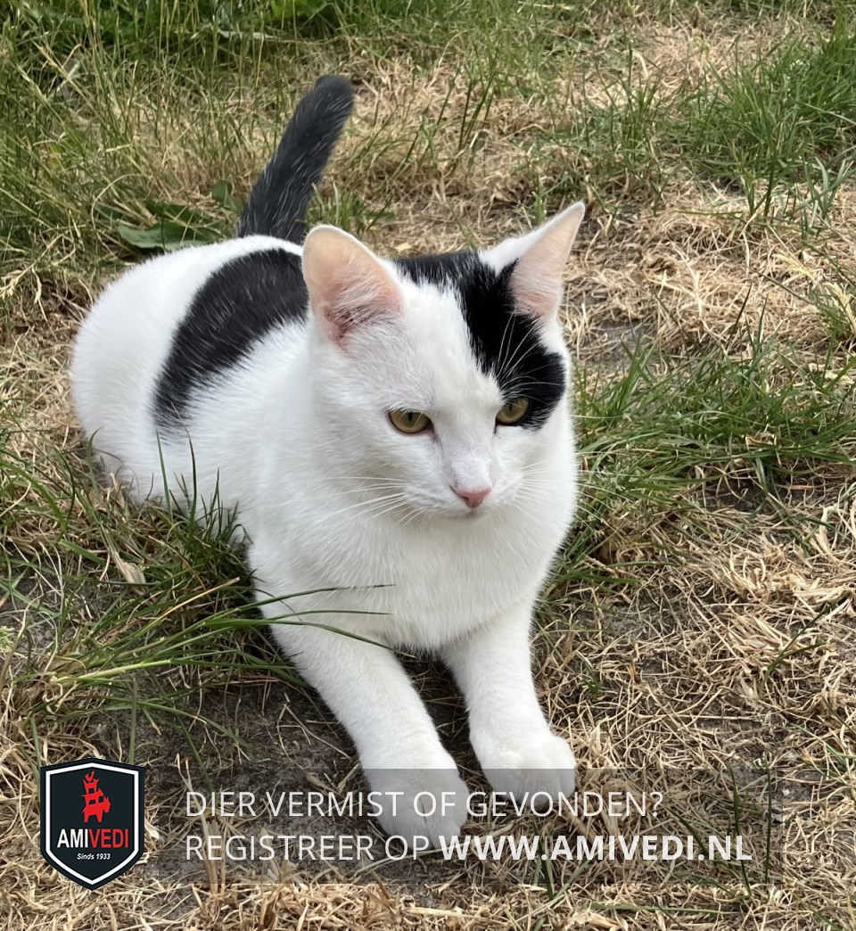 | Signalement | Voornamelijk wit. Zwarte vlek (streep) op linkerkant hoofd, vanaf de nek, bovenkant kop, langs het linkeroor tot net onder het linkeroog. Zwarte vlek op de rug. Zwarte staart. |