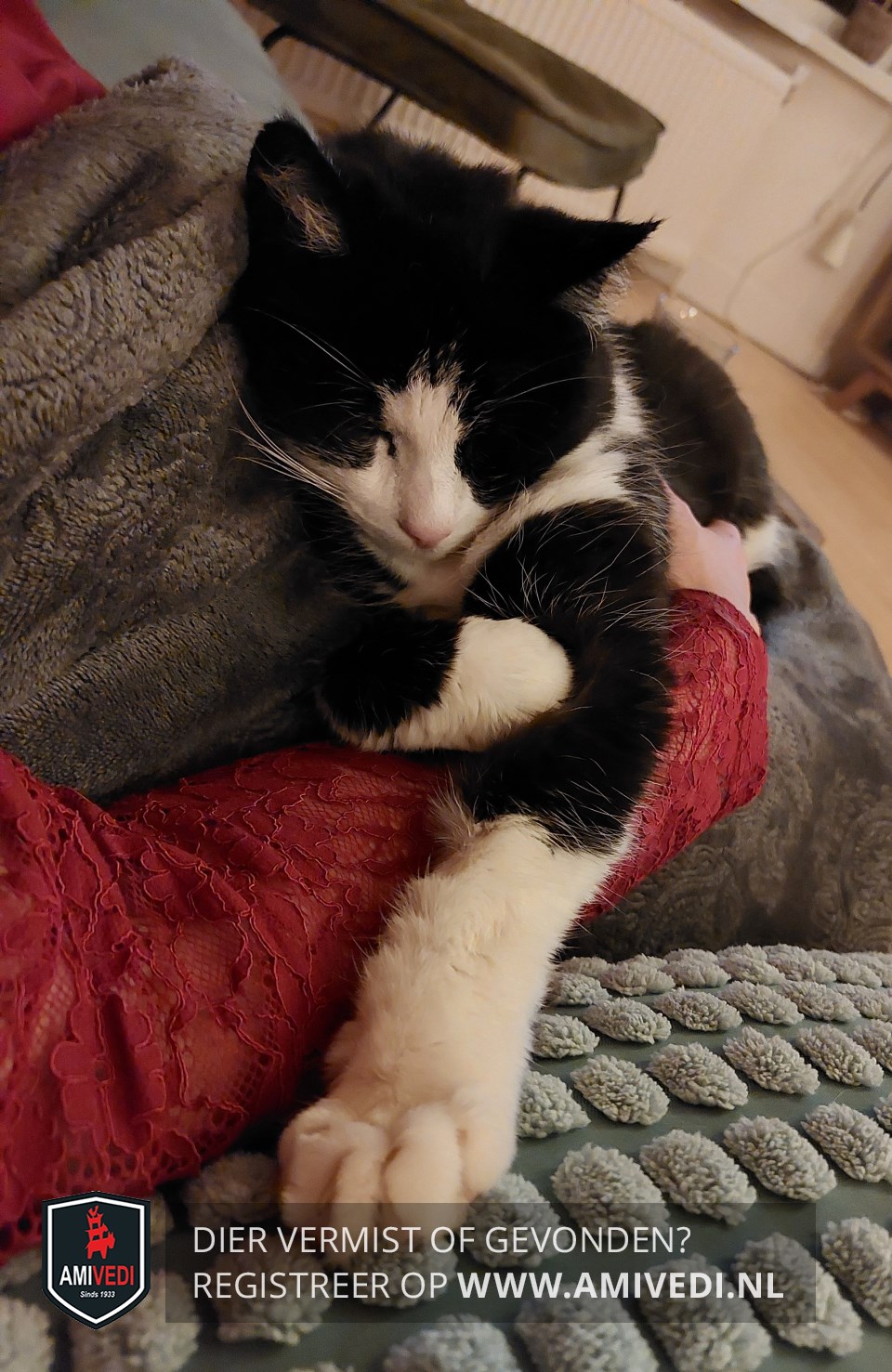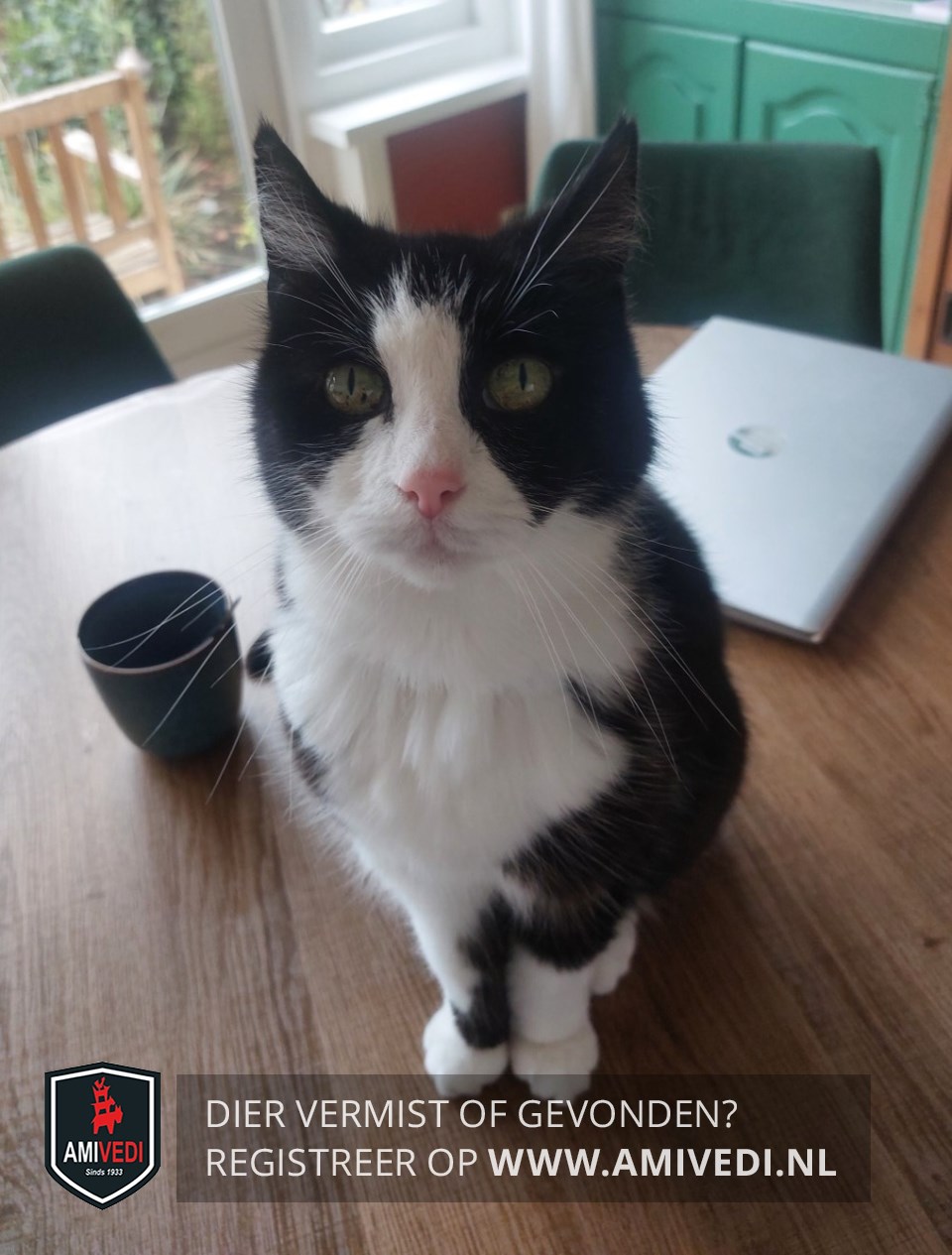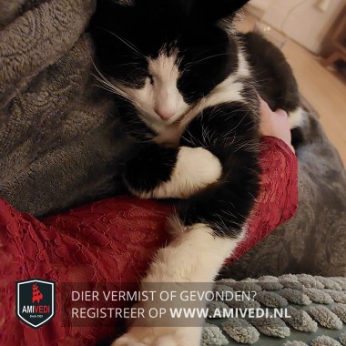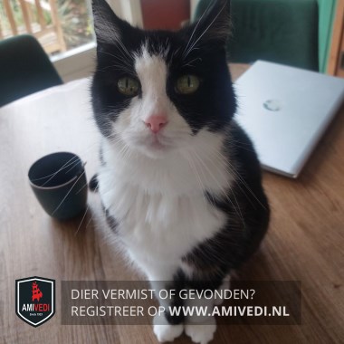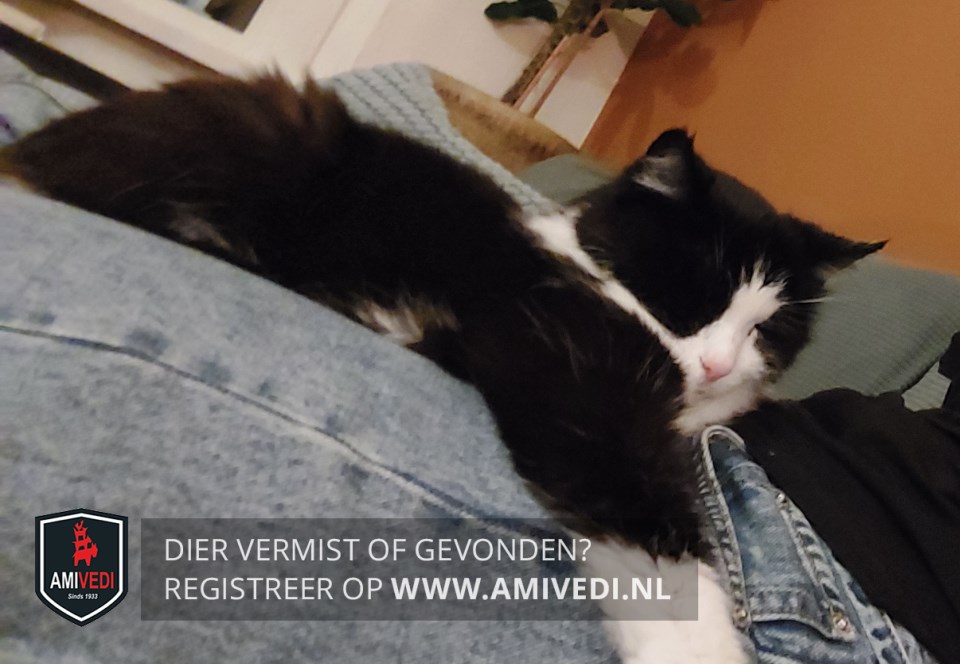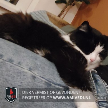 | Signalement | Europese korthaar poes, zwart met wit. Kopje, oren en wangen zwart. Witte bles en witte snuit, witte bef en witte borst en witte buik. Rechtervoorpootje wit met aan binnenkant zwarte vlek, linker voorpootje zwart met witte kniekous. |