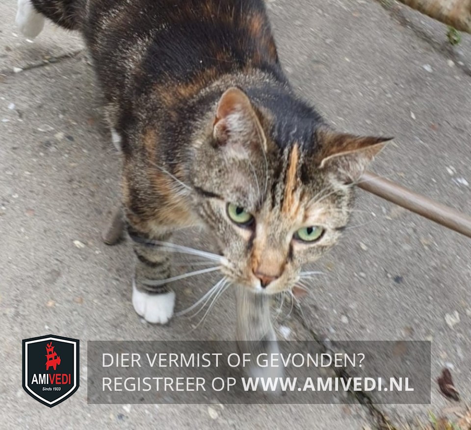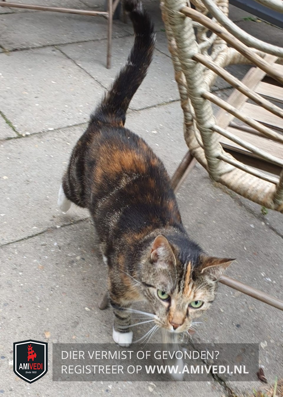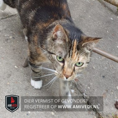 | Signalement | Cypers/schildpad. Kop is cypers bruin/zwart. Wit onder haar kop en hals. Schildpad zwart-rood/oranje rug en zijflanken, daar doorheen een paar cyperse strepen. Bijna zwarte staart met een paar lichte plekjes. Voorpoten cypers bruin/zwart met witte voetjes. Achterpoten cypers bruin/zwart met witte sokken. Ze heeft onder haar kop een kaal plekje waar vorige week bloed afgenomen is. |