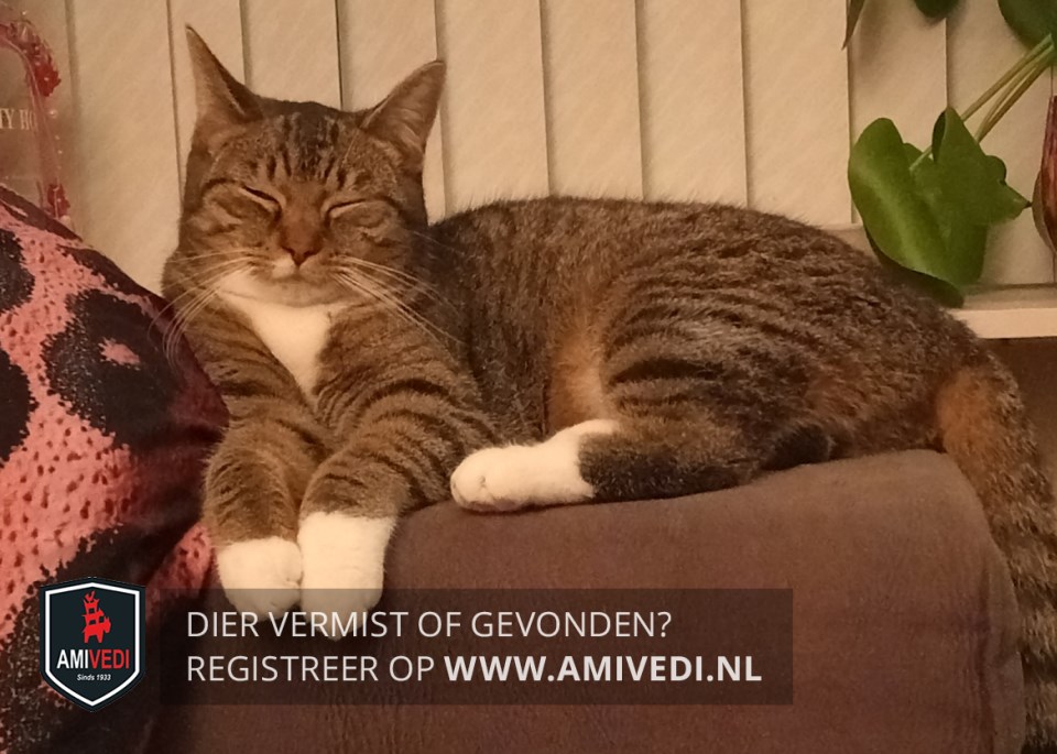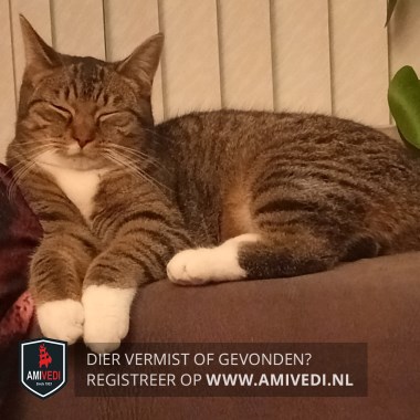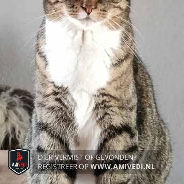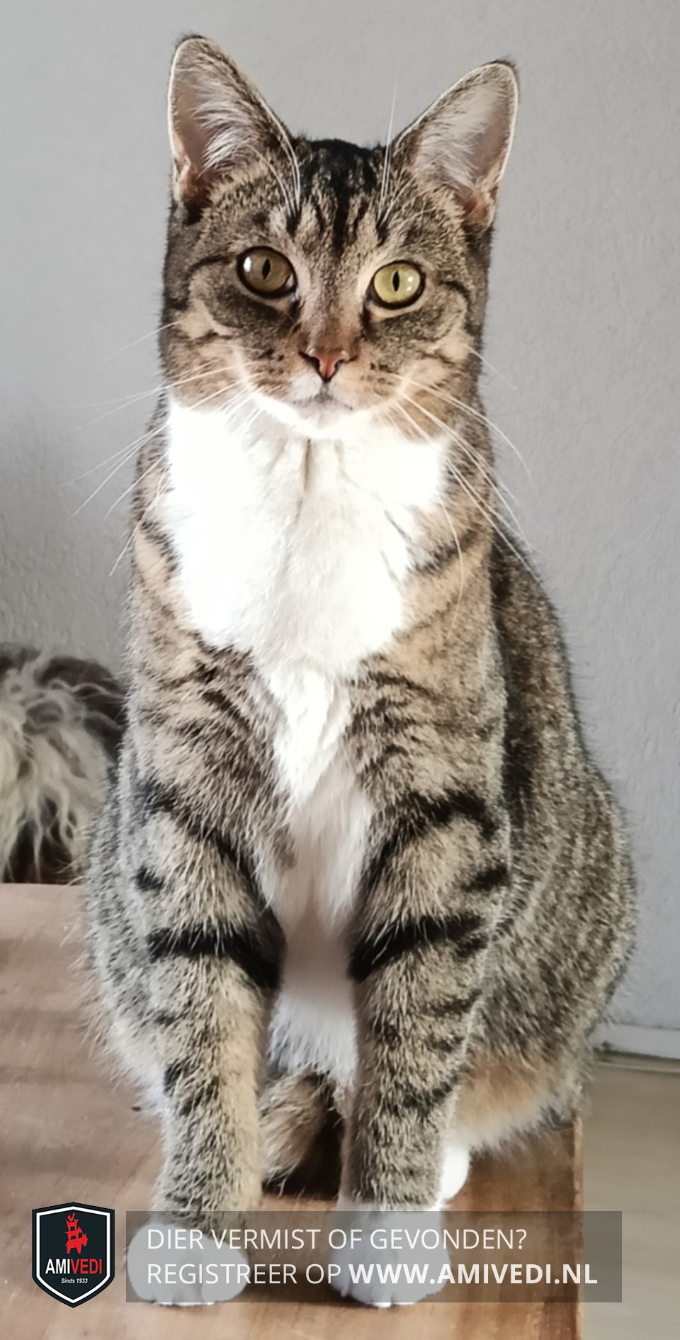 | Signalement | Europese korthaar poes, grijs/bruin met zwart gestreept en wit. Onder de neus wit, witte kin, witte bef, witte borst en witte buik. Rechter voorpootje wit voetje, linker voorpootje wit sokje. Linker achterpootje met witte sok. |