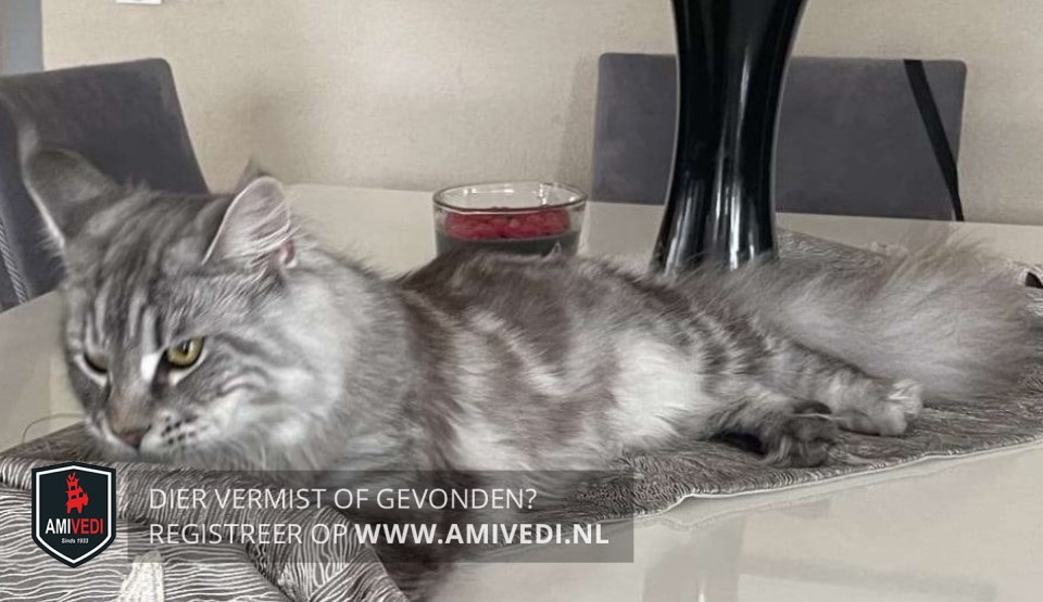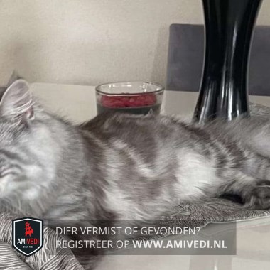 | Signalement | Maine Coon, grijs met zwart gemarmerd en wit. Bovenop kopje grijs met zwart gestreept, ooghoeken wit en onder de ogen een witte rand. Snor wit en grijs/wit gemêleerde kraag. Over de rug en flanken grijs met zwart gemarmerd. Op de buik enkele witte vlekken. |