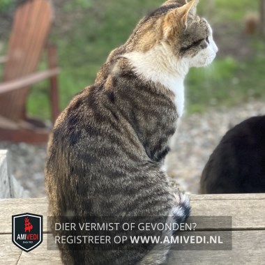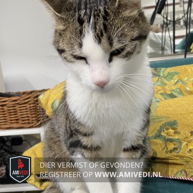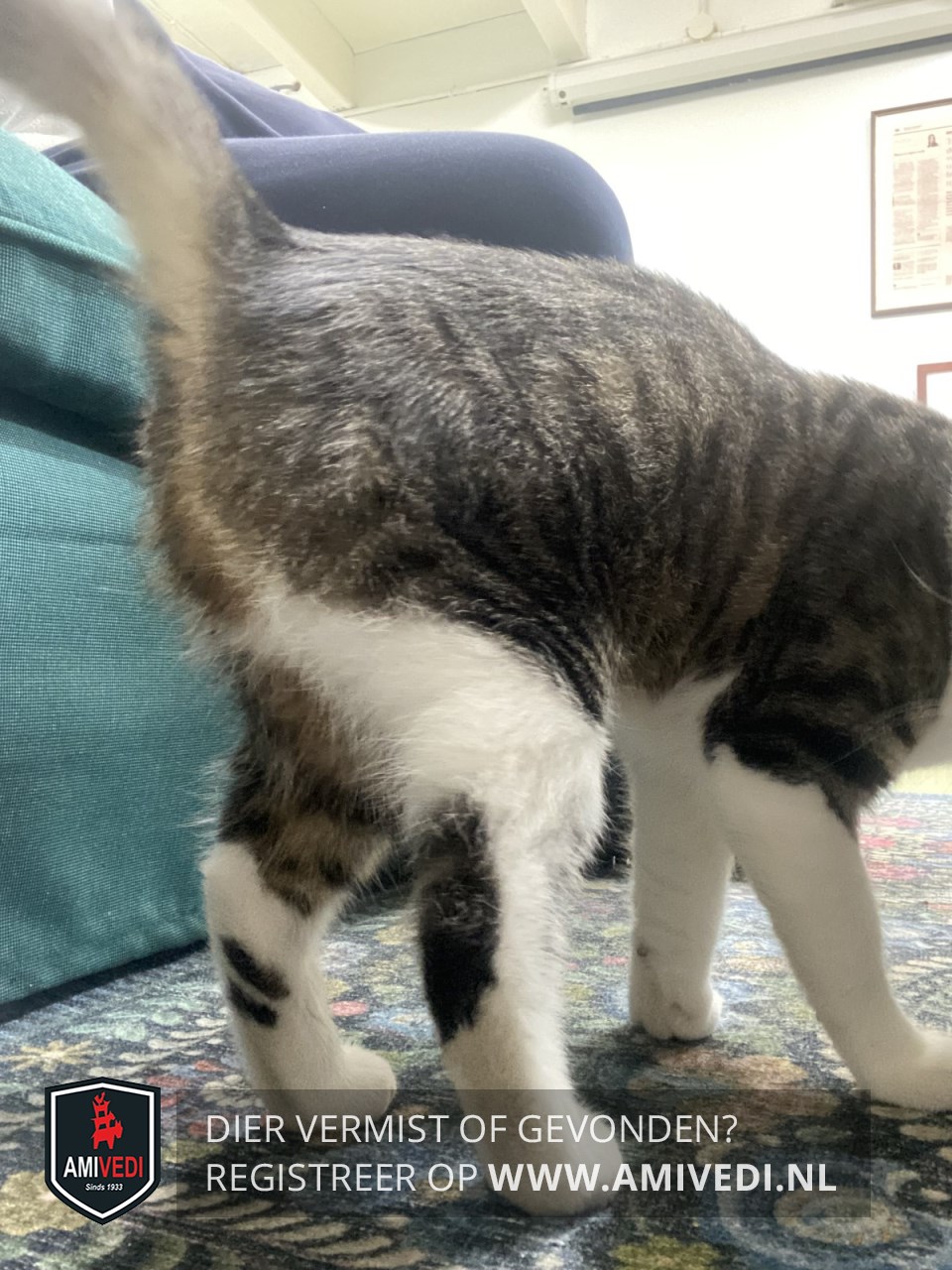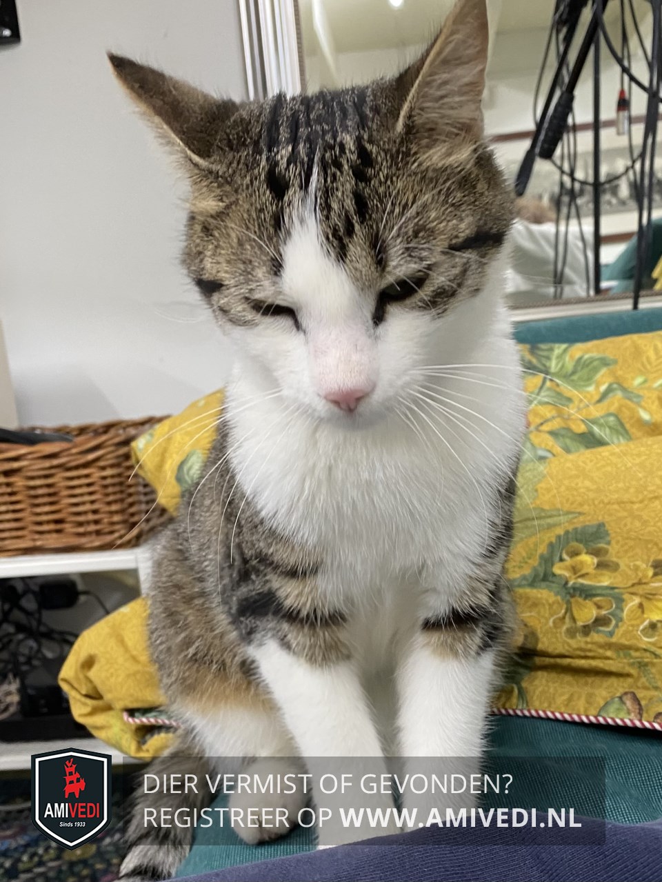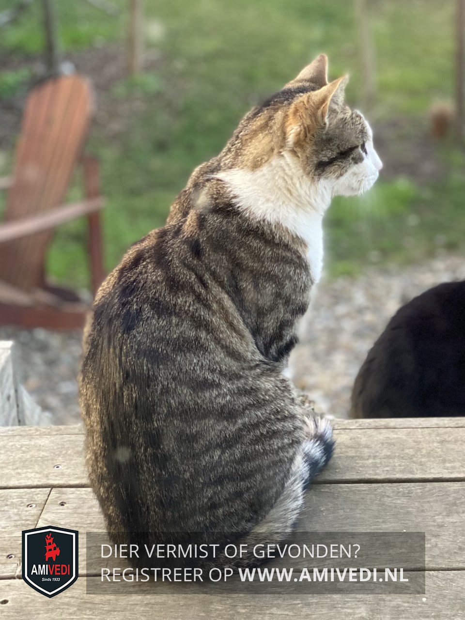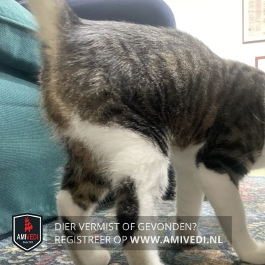 | Signalement | Cypers grijs zwart gestreept met wit. Wit voorhoofd dat uitloopt over de neusbrug in witte snoet, witte borst, witte voorpootjes, witte buik, witte rechter achterpoot met donkere vlek op de hiel vanaf de hak, witte sok links achter met twee donkere vlekjes halverwege de hiel. |