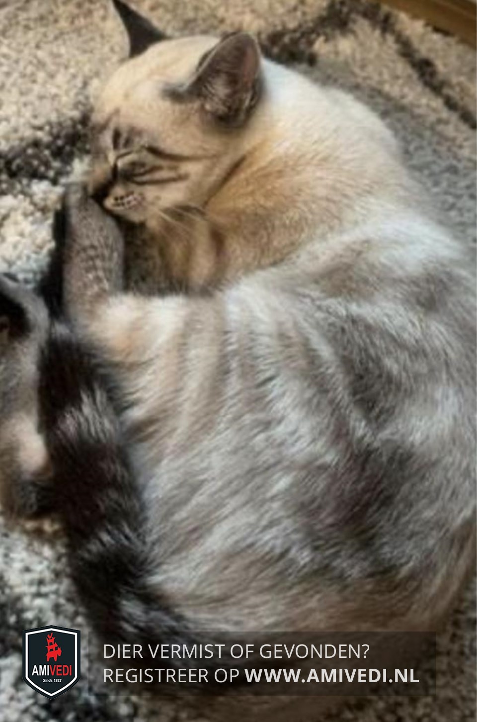 | Signalement | Beige/grijs/Wit. Grijs gestreepte kop. Witte kin en bef, Voorpoten zijn gestreept. Rug is beige en heeft ook wat grijze strepen in de vacht. Donkere gestreepte staart. Heeft blauwe ogen. |