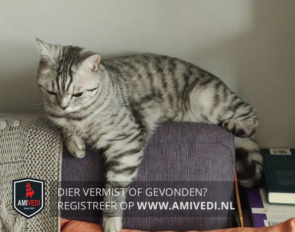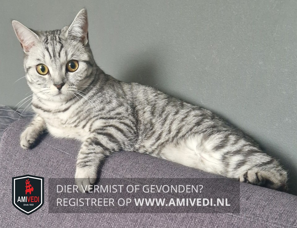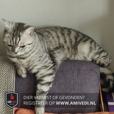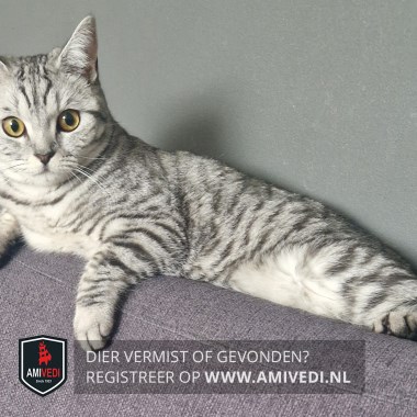 | Signalement | Zilvergrijze cyperse poes met zwarte strepen. Geel/goudkleurige ogen met donkere lijntjes langs de ogen en een roze neusje met donker randje. Lichte kin en bijna witte snoet. Lichte buik en binnenkant poten. Staart met donkere ringen en donker puntje. |