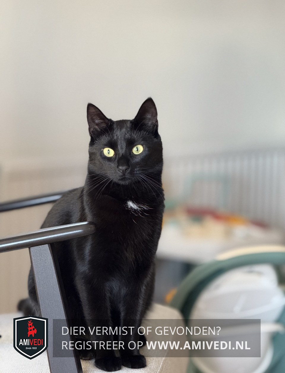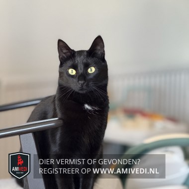 | Signalement | Zwarte kat met een heel klein wit vlekje op zijn borst. |