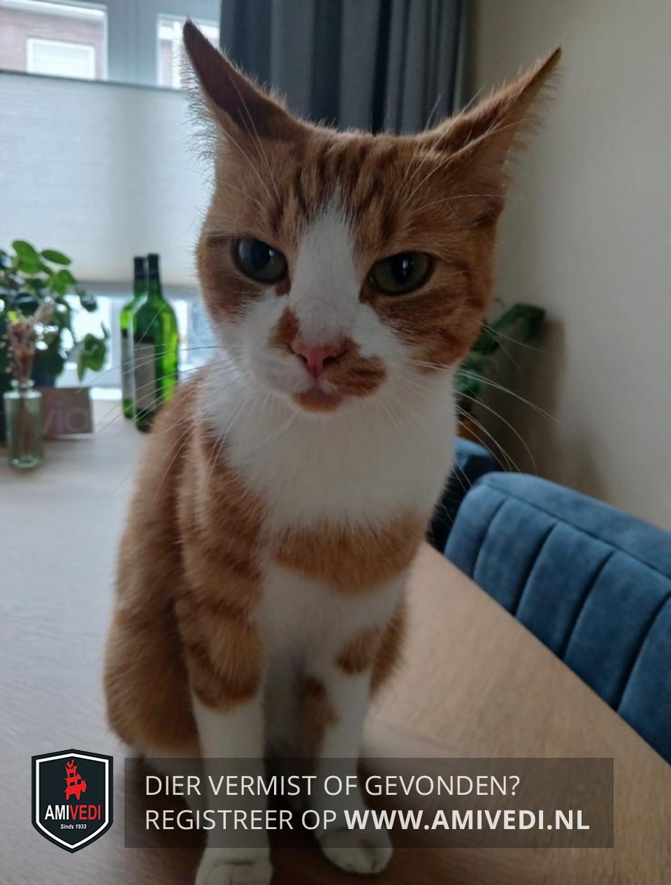 | Signalement | Europese korthaar, rood/oranje gestreept met wit. Kopje en oren rood/oranje gestreept, witte bles, wit snuitje met oranje vlekjes naast de neus en oranje kin. Witte kraag, oranje vlek op de borst, witte buik. Rechter voor- en achterpootje witte kniekous, linker voorpootje wit met oranje vlekken. |