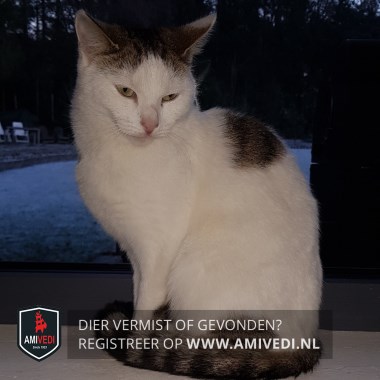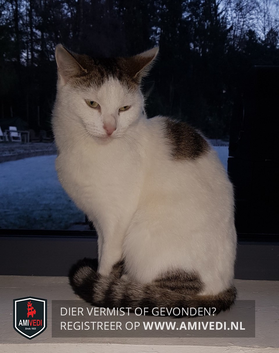 | Signalement | Voornamelijk wit met cypers bruin/zwart gestreepte vlekken. Cypers bruin/zwarte oren, bovenop de kop. Cypers bruin/zwart loopt door over het achterhoofd en nek. Wit boven en rondom de ogen. Witte neusbrug, rondom roze neus en bek. Witte bef, borst en buik. Op de witte rug een cypers bruin/zwart gestreepte vlek, bij de linker heup een cypers bruin/zwart gestreepte vlek. Staart cypers bruin/zwart geringd. Witte poten. |