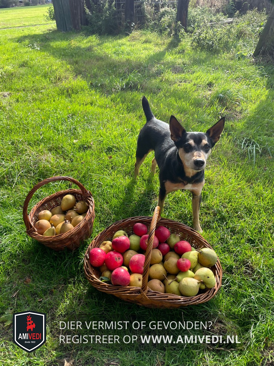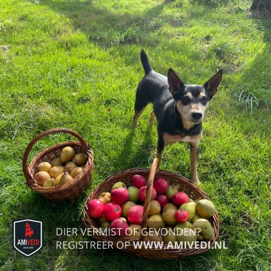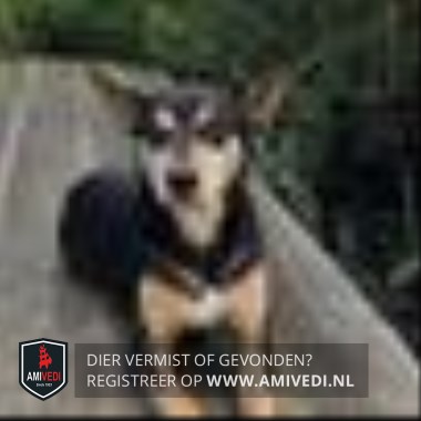 | Signalement | Terrier, black and tan, zwart met bruin en een beetje wit. Let op: hondje luisterd beter naar Engels! Bruine wenkbrauwtjes, bruine snuit (met grijze haartjes), bruine borst met in het midden een wit vlekje, bruine voorpootjes, bruine achterpootjes. Grote staande oren en een kort één derde staartje. |