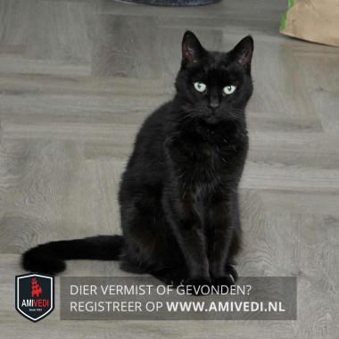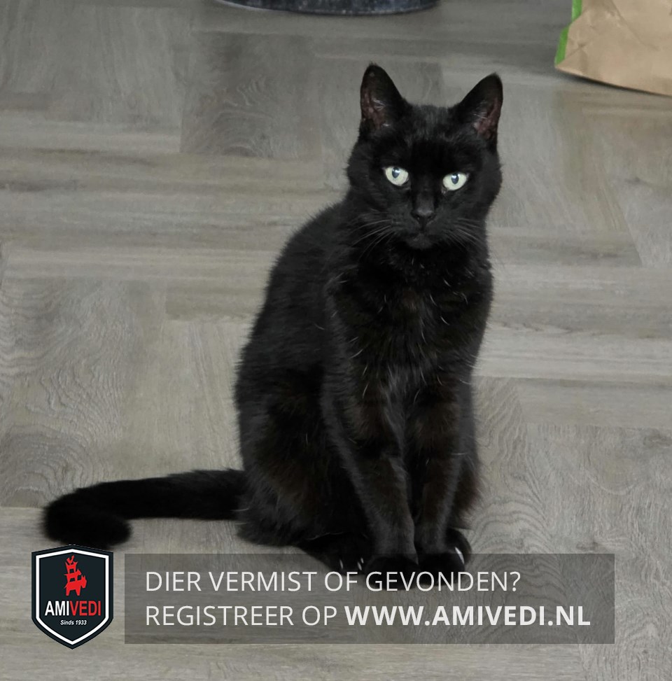 | Signalement | Europese korthaar poes, volledig zwart met enkele witte haartjes op de buik. |
