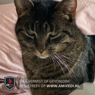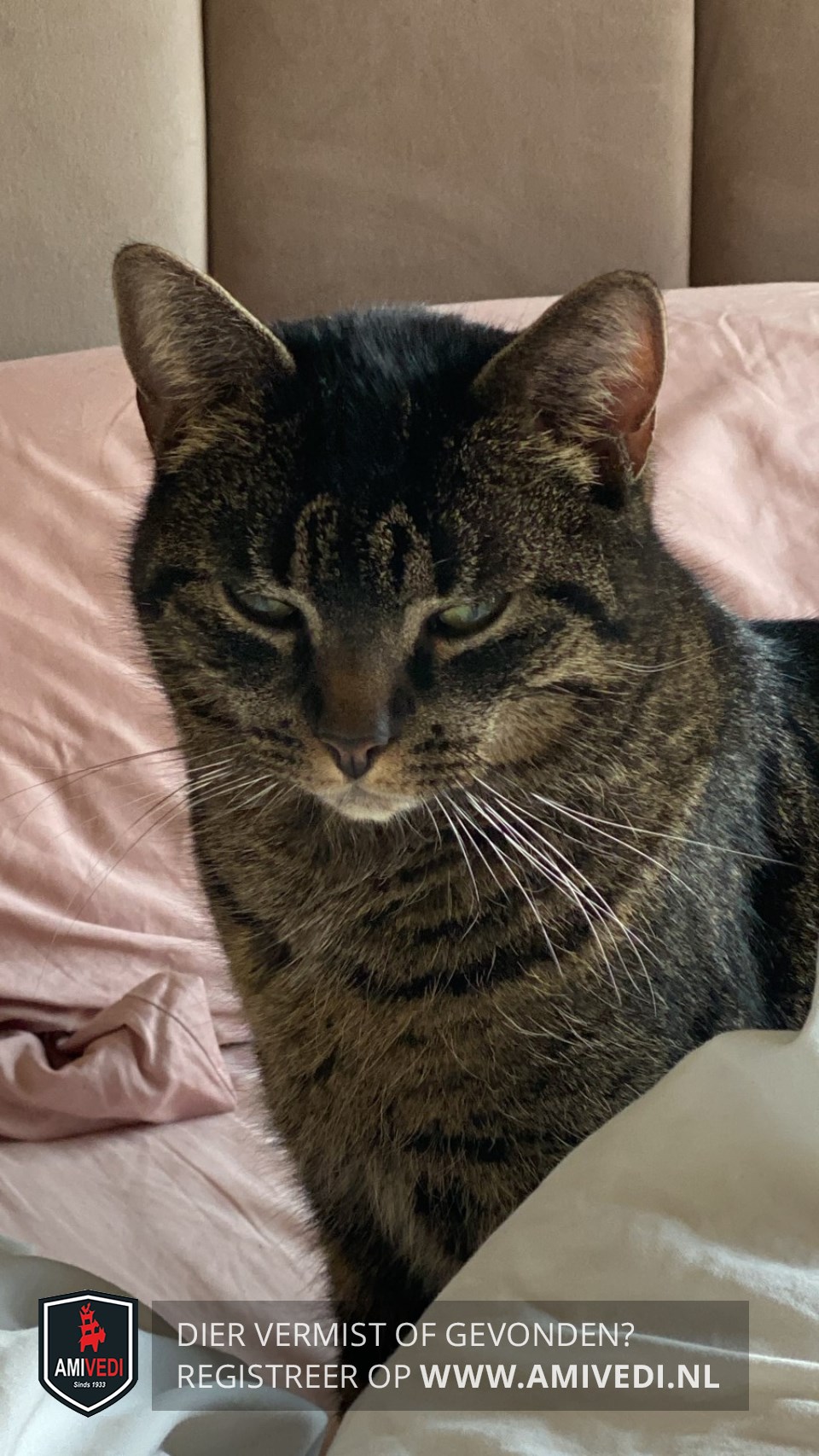 | Signalement | Cypers bruin/zwarte kater, licht randje om de oogjes, lichtbruin/grijs rond het bekje. Zwarte streep op de bovenkant van zijn rug. Geen wit. |