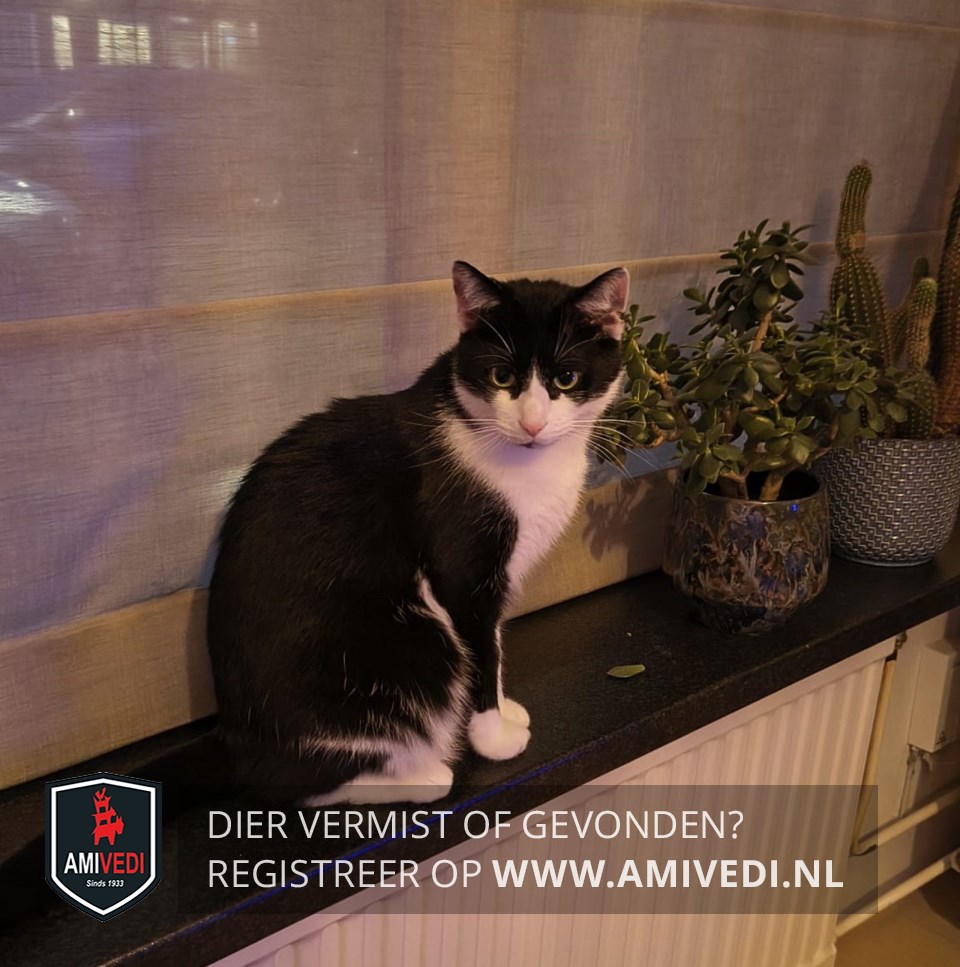 | Signalement | Grote zwart-witte kater. Zwart bovenop de kop, voorhoofd, rondom de ogen. Onder beide ooghoeken aan de neuskant loopt het zwart als een soort druppel naar beneden. Op de neusbrug, tussen de ogen, begint het wit in een punt wat wijder uitloopt tot rondom neus en bek. Rechts op onderlip klein zwart vlekje. Witte kaaklijn (rechts en links), kin, bef, borst en buik. Zwarte rug, zijflanken en staart. Linker voorpoot wit. Rechter voorpoot zwart met wit voetje. Rechter achterpoot zwart met witte sok. |