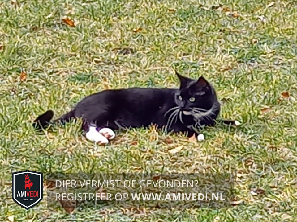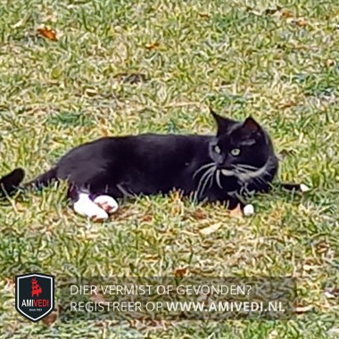 | Signalement | Zwart met een beetje wit. Zwarte kop met witte snorharen. Witte kin en bef. Witte teentjes voor. Achterpoten witte voetjes maar niet goed te zien in hoeverre. Verder geheel zwart. Klein qua postuur. |